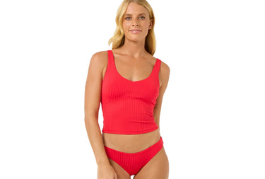 This tankini bikini top provides full support and is made from recycled polyester wide rib fabric. It features a metal logo trim, an internal shelf bra for added support, and adjustable shoulder straps for a customizable fit.