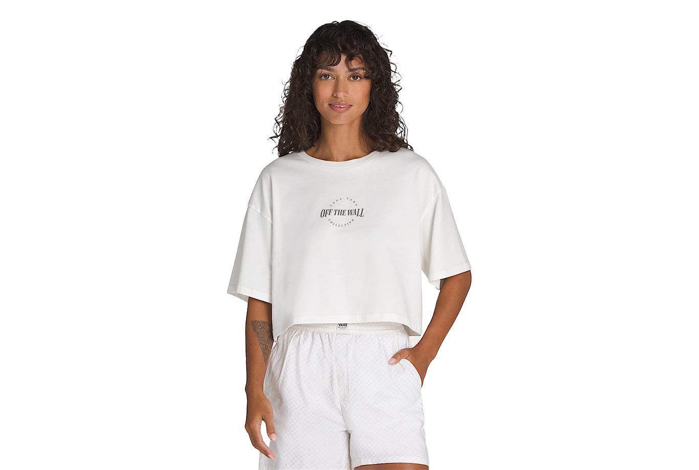 Keep it uncomplicated in the Rylen T-Shirt, a relaxed crop crew neck T-shirt with a with a simple Vans® graphic showcasing heritage details.