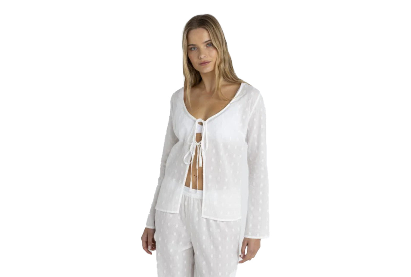 The Mirage Long Sleeve Top in White blends elegance with comfort. Made from lightweight, 100% cotton dobby fabric, it features a tie front, relaxed fit, and V-neckline. With slightly flared sleeves, it partners with any outfit to add a touch of coastal chic. Material 100% COTTON