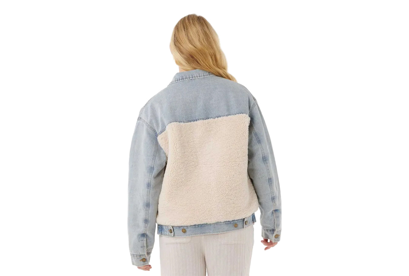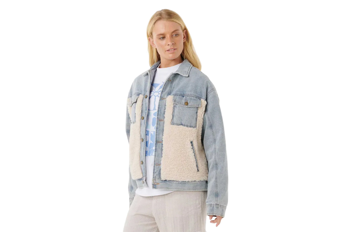 Vintage vibes meet modern warmth. The Cruisin' Sherpa Jacket combines washed denim with a soft sherpa lining, metal hardware, and classic button front. Perfect for cool nights by the coast.