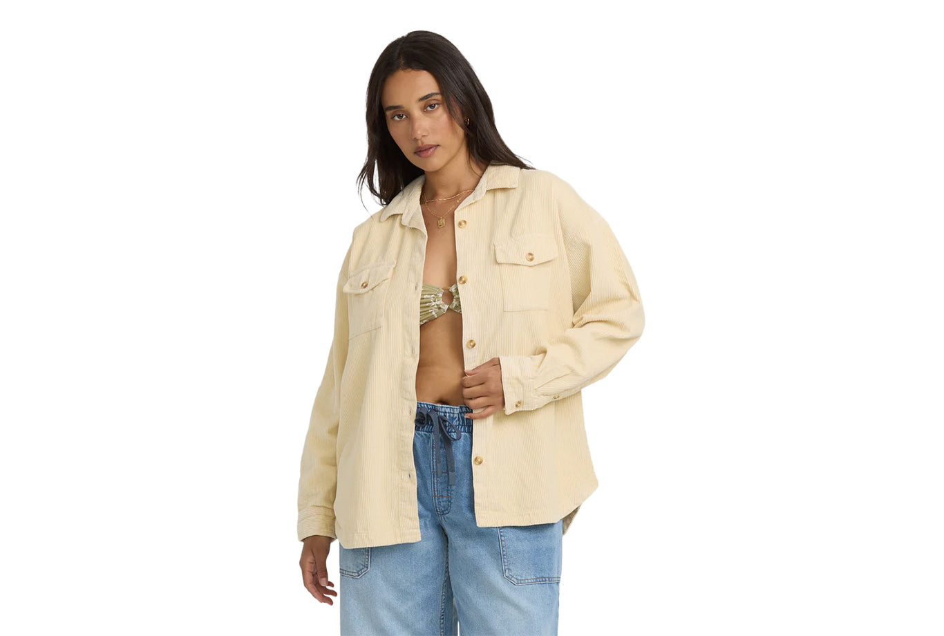 Breakfast ran long. The Fadeaway Long Sleeve Shacket kept us comfy and polished. Oversized corduroy layers easily, button down closure adjusts airflow, front patch pockets stash essentials, and a subtle metal plate flashes just enough shine. Featured here in the Whitecap colorway.