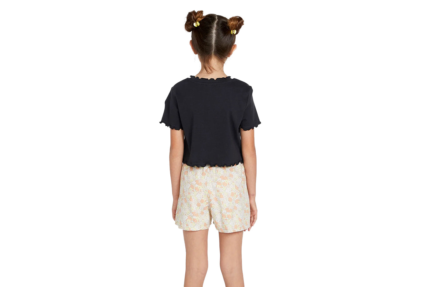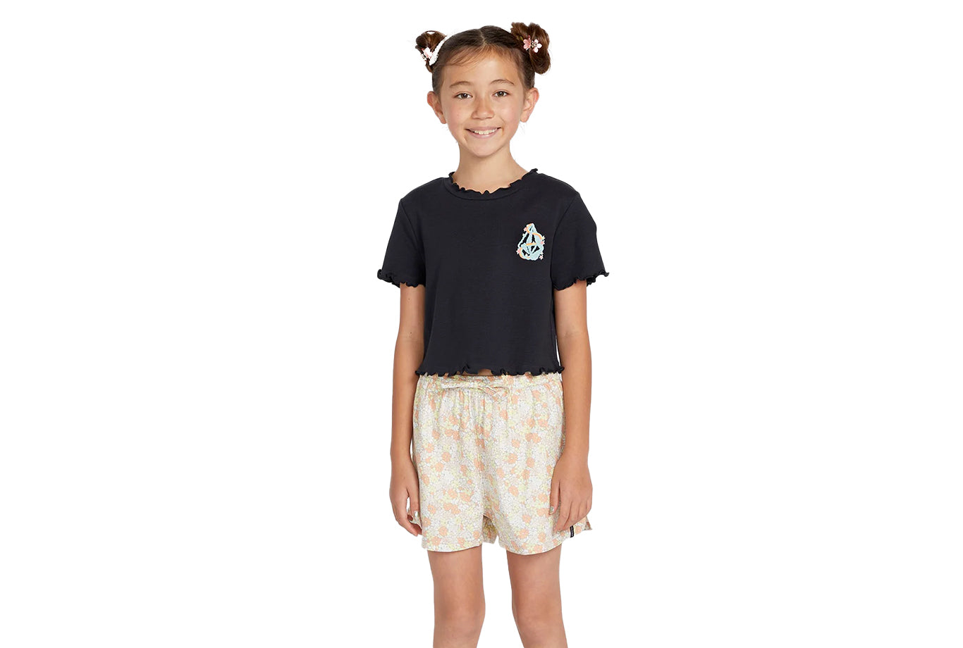 Give her the perfect introduction to skate style with Volcom Girls' 1991 Short Sleeve Shirt. Crafted with cotton baby rib fabric, this youth t-shirt features a relaxed fit, a screenprint at the chest, and lettuce edge detailing (baby ruffles) at the neck, sleeves and hem.