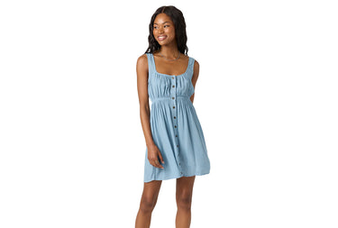 Soak up some sunshine in this breezy mini. It features a front button design, elastic waist and solid color wash.