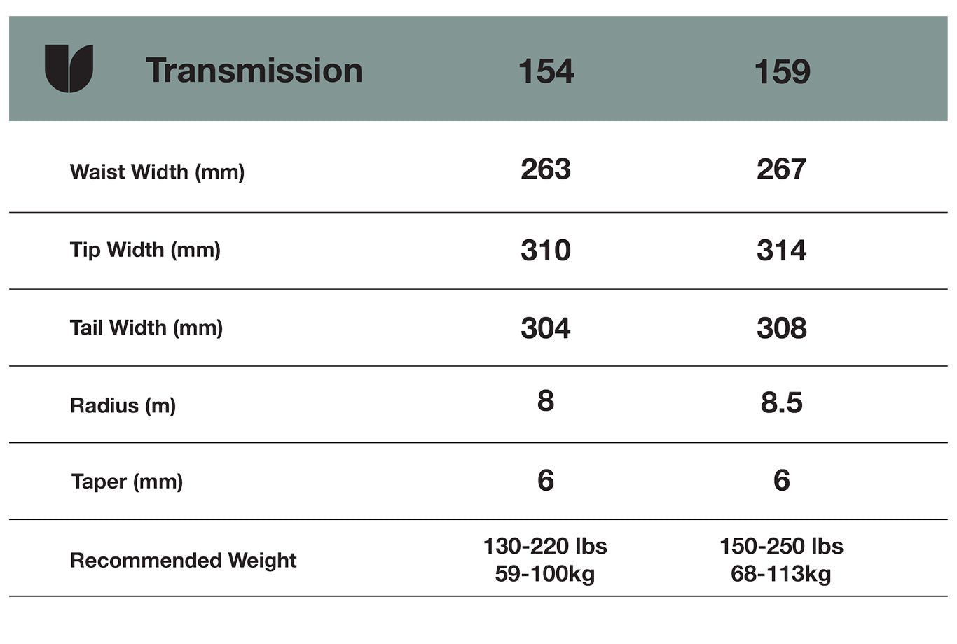 For those looking to take stability, speed and performance to new dimensions, the Transmission board will set the line and take you there. The Transmission encourages fast, deep carving. Its unique shape consists of maximum effective edge packed into reduced overall lengths, with increased widths and elliptical sidecut. The Transmission makes no compromise, suiting the advanced rider who throws everything they’ve got at the mountain.