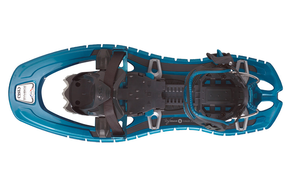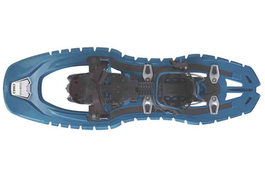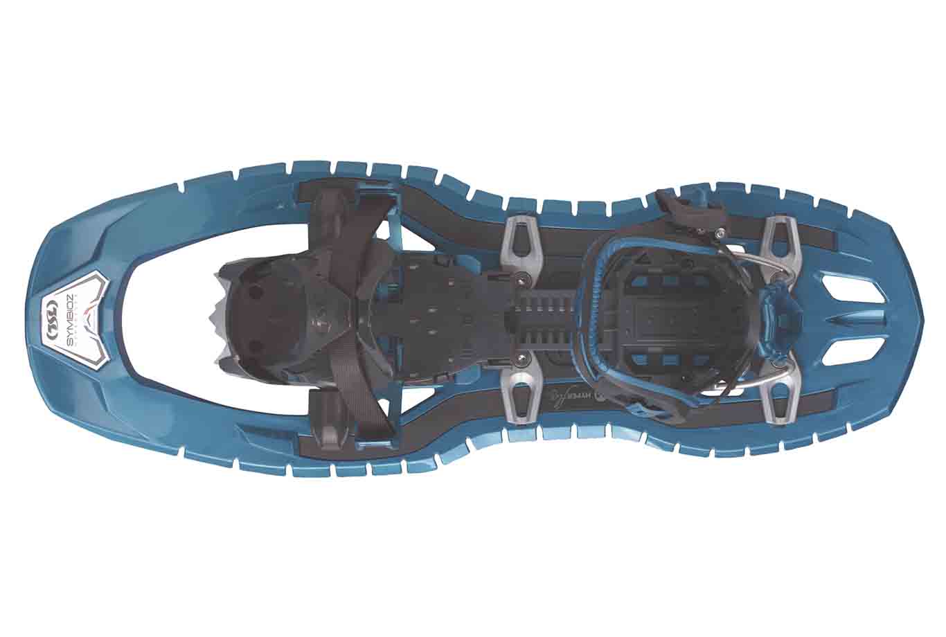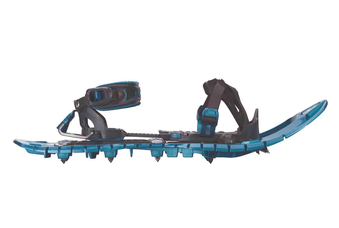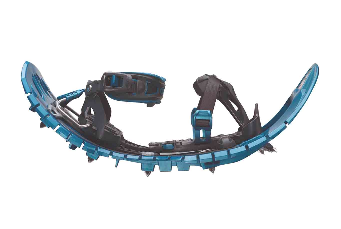 Never has a snowshoe offered such outstanding grip. Combined with the vertical blades, the stainless steel bidirectional crampons placed under the foot give incredible traction (uphill), excellent grip (downhill) and perfect drift control (incline). The flexible frame follows the shape of the terrain, provides superb stability and complete safety and avoids sudden sliding in powder snow.