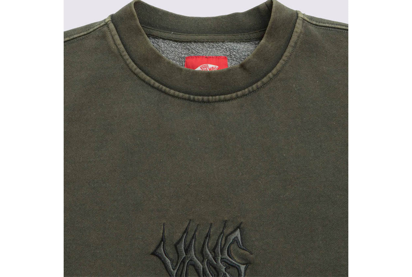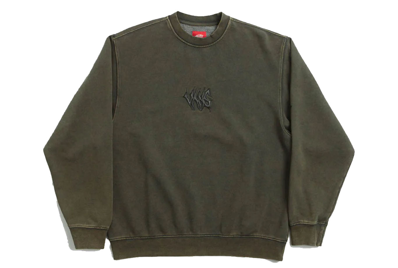 Vans Skate Metal Crewneck Sweatshirt in Grape Leaf. Regular fitting, this block tone Vans sweatshirt is made from cotton-polyester blend with brushed fleece inner. Featuring ribbed cuffs and woven elastic hem, this green Vans sweater is finished with an embroidered chest graphic and woven checkerboard logo branding.