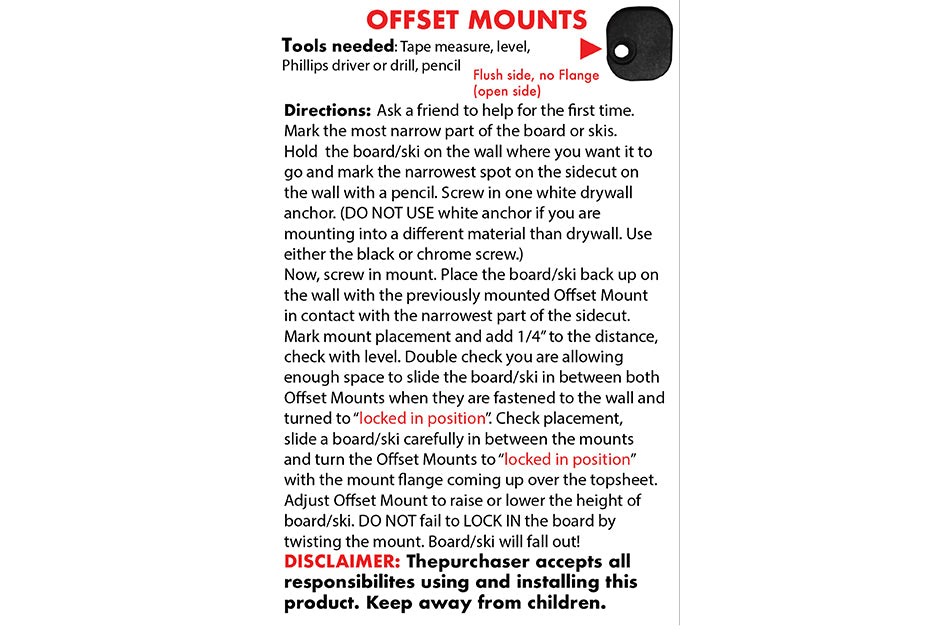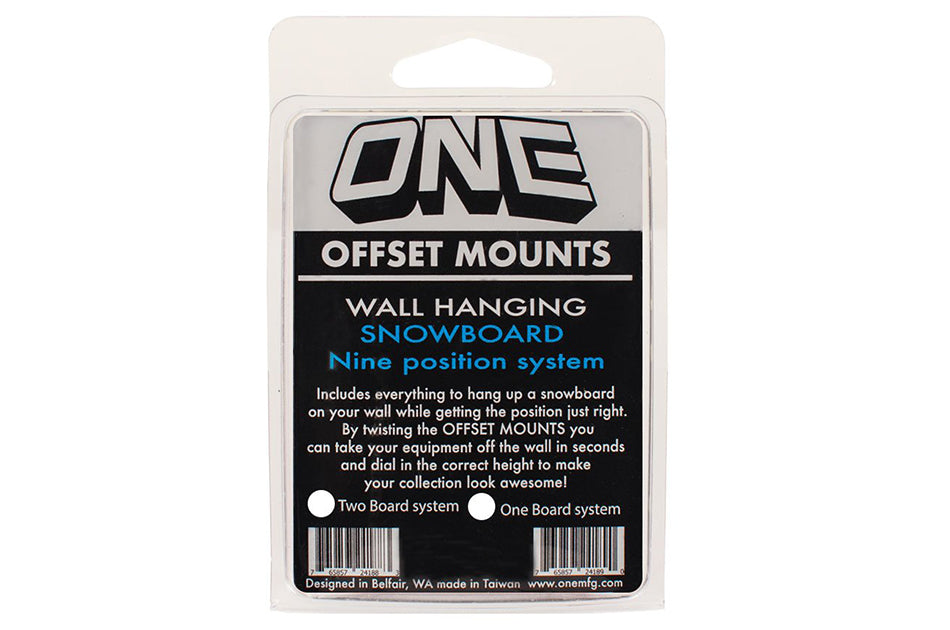 Our patent-pending Offset Mounts are a nice position system that safely and cleanly mounts your snow board or even skis in some cases to the wall. By rotating the Offset Mounts, you are able to dial in the distance between the two mounts so another sized board will fit into the same area without re-drilling. And the height of the board can be changed by rotating the mount around. Great for the vintage snowboard collector or any snowboard or ski's.