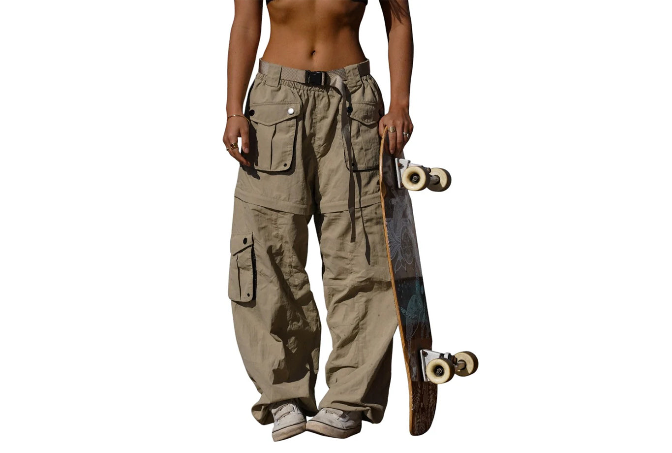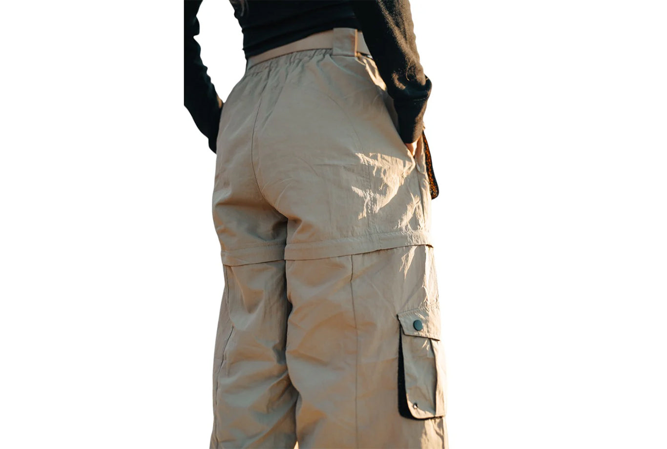 - Features : 2 invisible hand pocket on each side, 2 snapped cargo pockets on the hips and 1 snapped side cargo pocket on the leg, elastic waistband, belt with side release buckle, elastic to the ankles , detach the pant legs to transform them into shorts with 3" inseam.