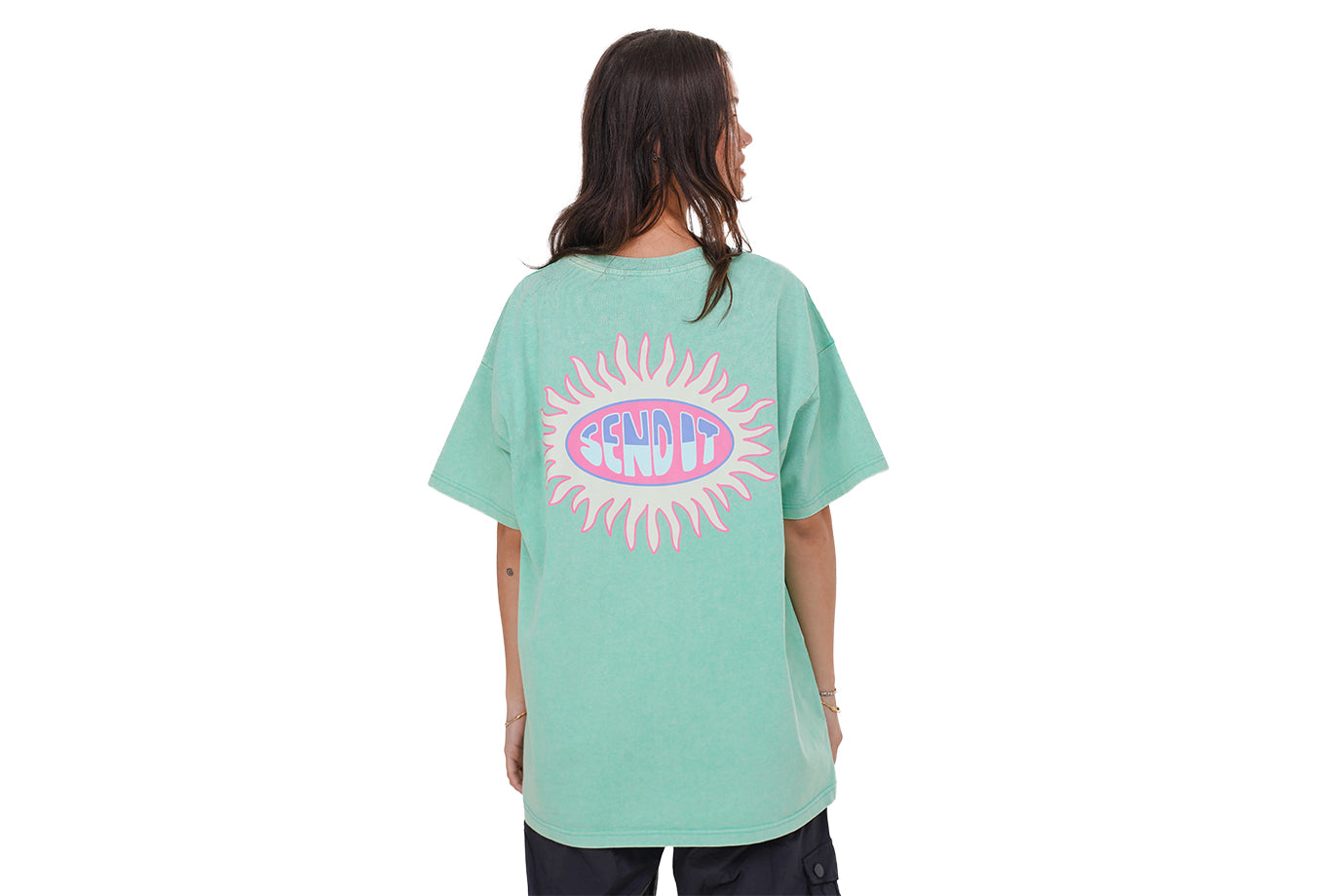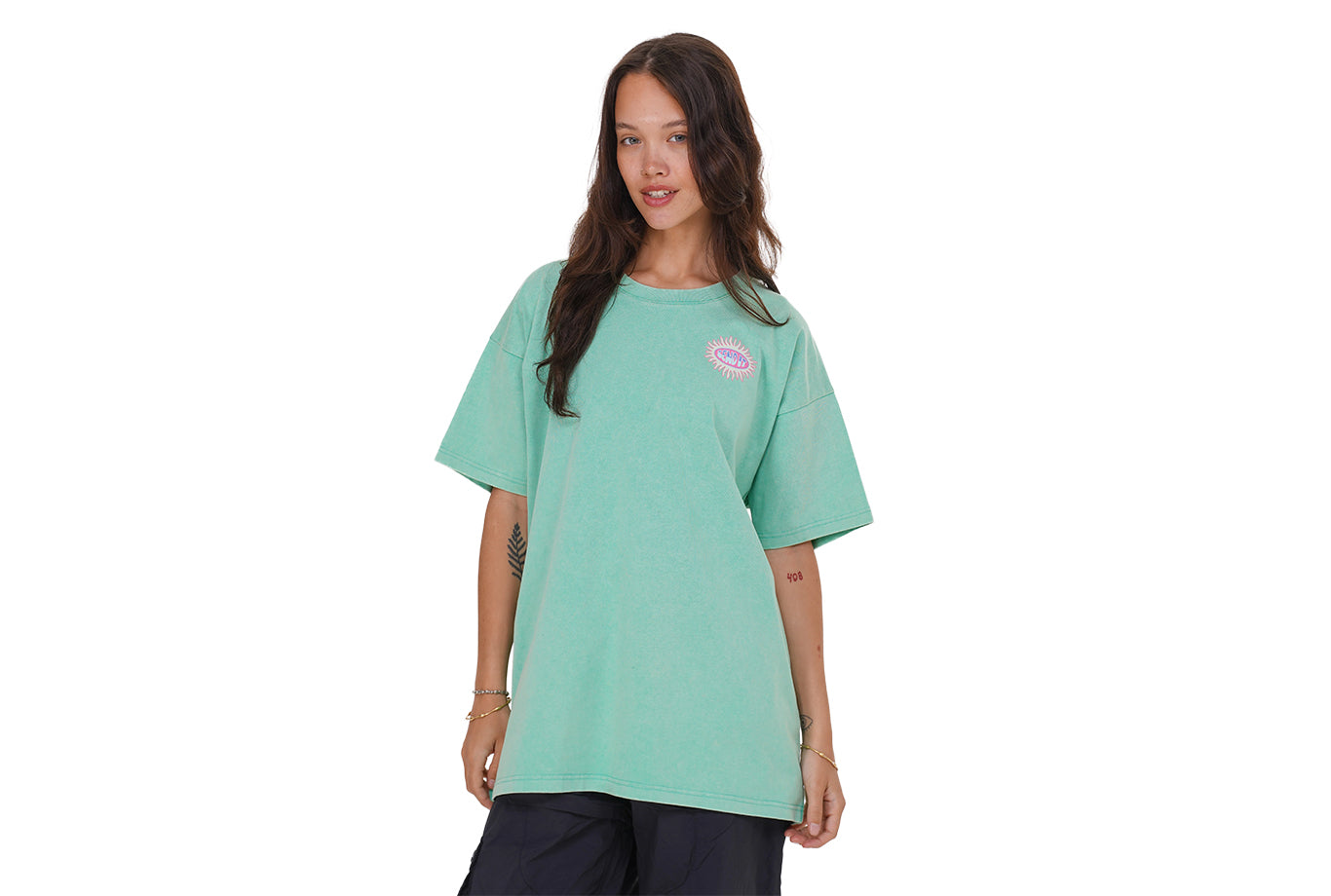 Color: Turquoise with a print on the chest and to the back. This item is designed with a washed finish that creates a vintage look and natural variations in color intensity. Small lighter spots may occasionally occur, but do not affect the overall look or quality of the product.