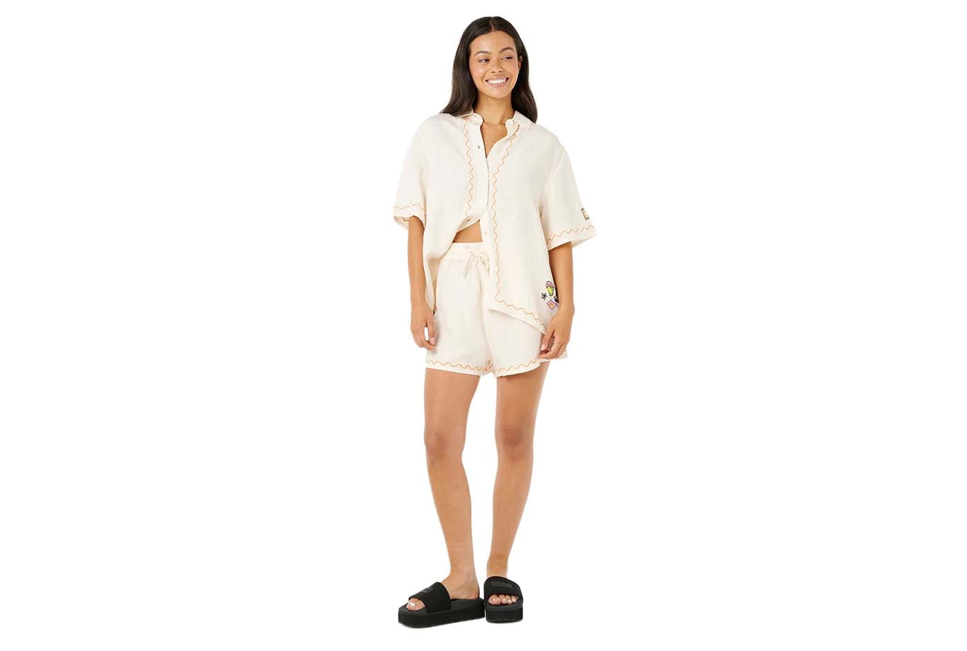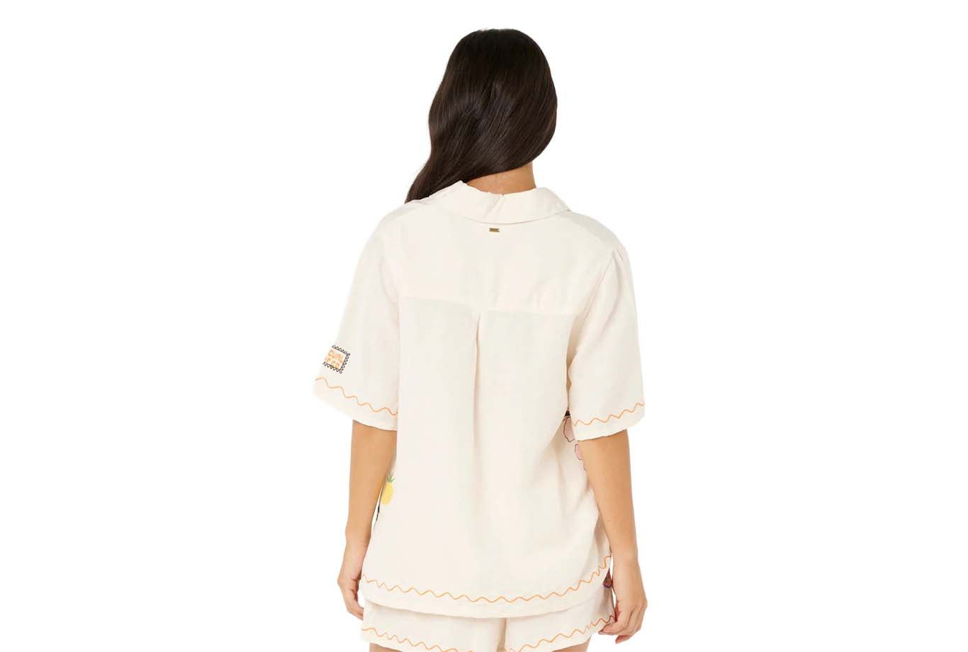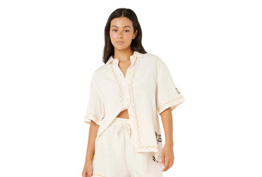 The Sunset Luau Embroidered Shirt blends linen-viscose fabric with a relaxed fit and button-up design. It features a placement border print at the hem, delicate embroidery detailing, and a garment wash for added softness, making it a sure wardrobe staple.