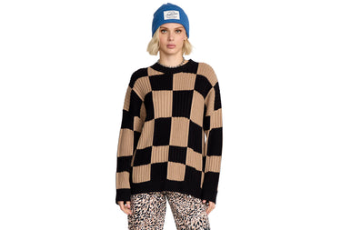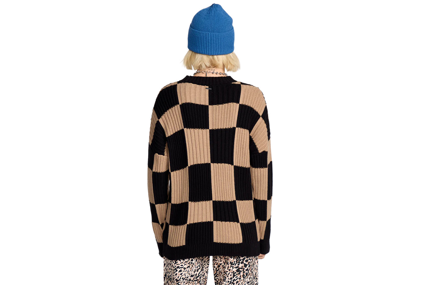 ● Novelty wide rib, warped checkerboard intarsia pattern at body