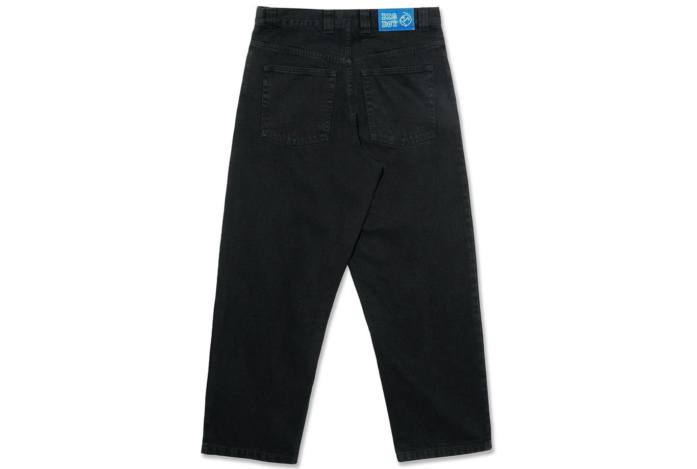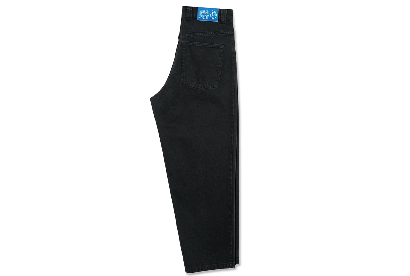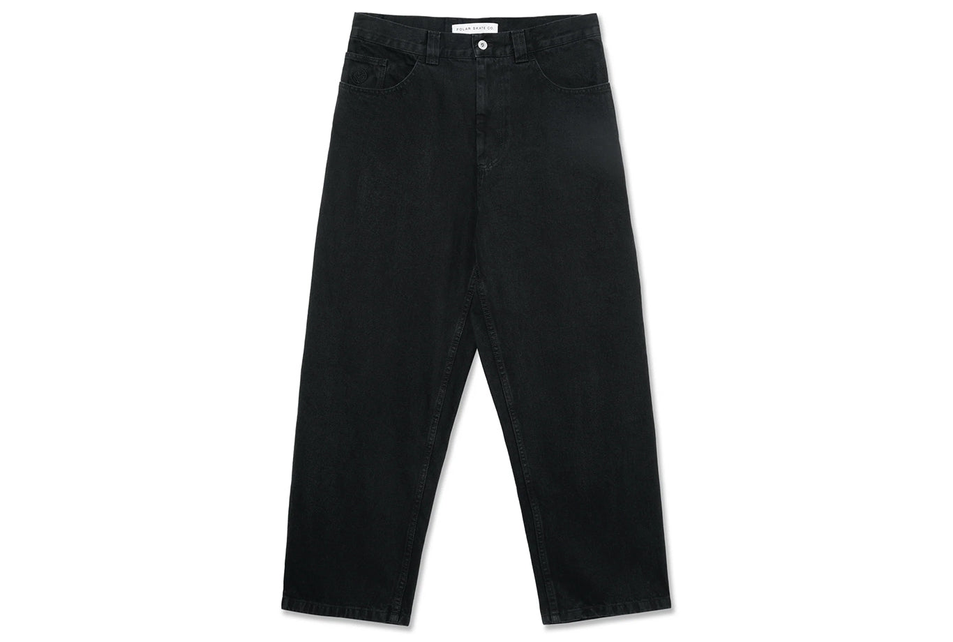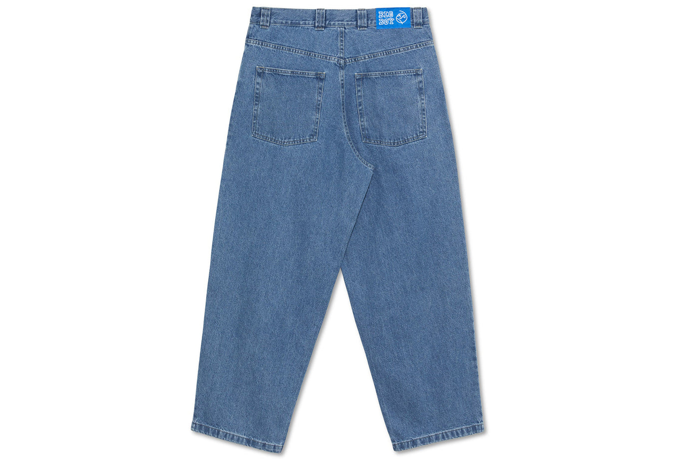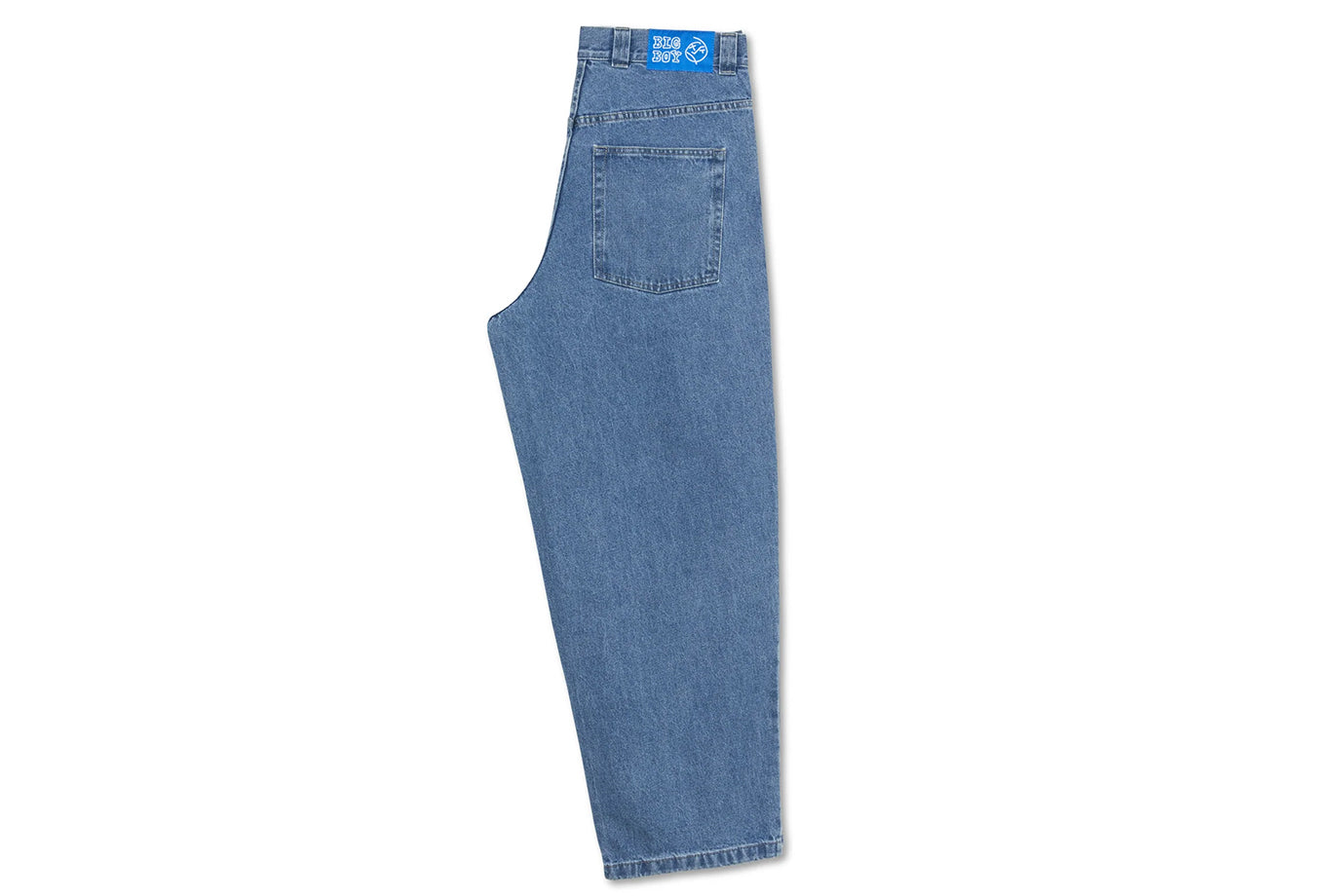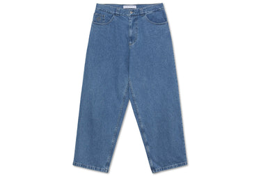 High-waisted baggy jeans with tapered legs. Made from 100% mid blue cotton denim with a heavyweight 435 gsm feel. Features a YKK zipper, custom YKK button, and embroidered detail on the change pocket. Finished with a woven label on the waist.
