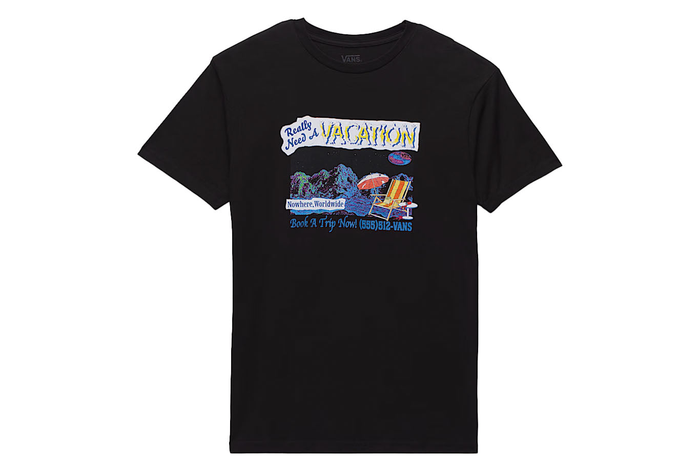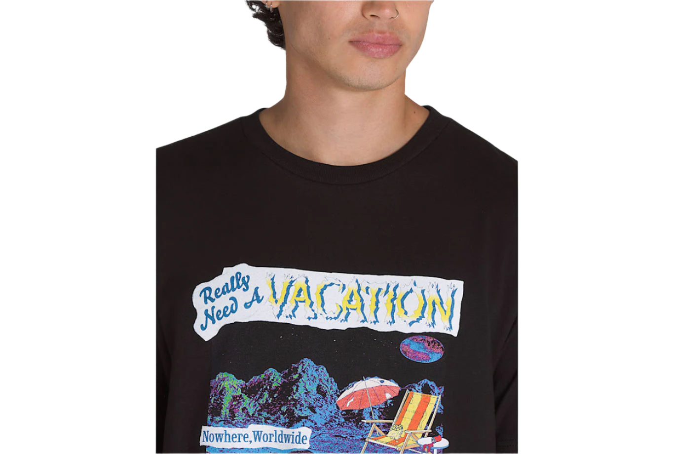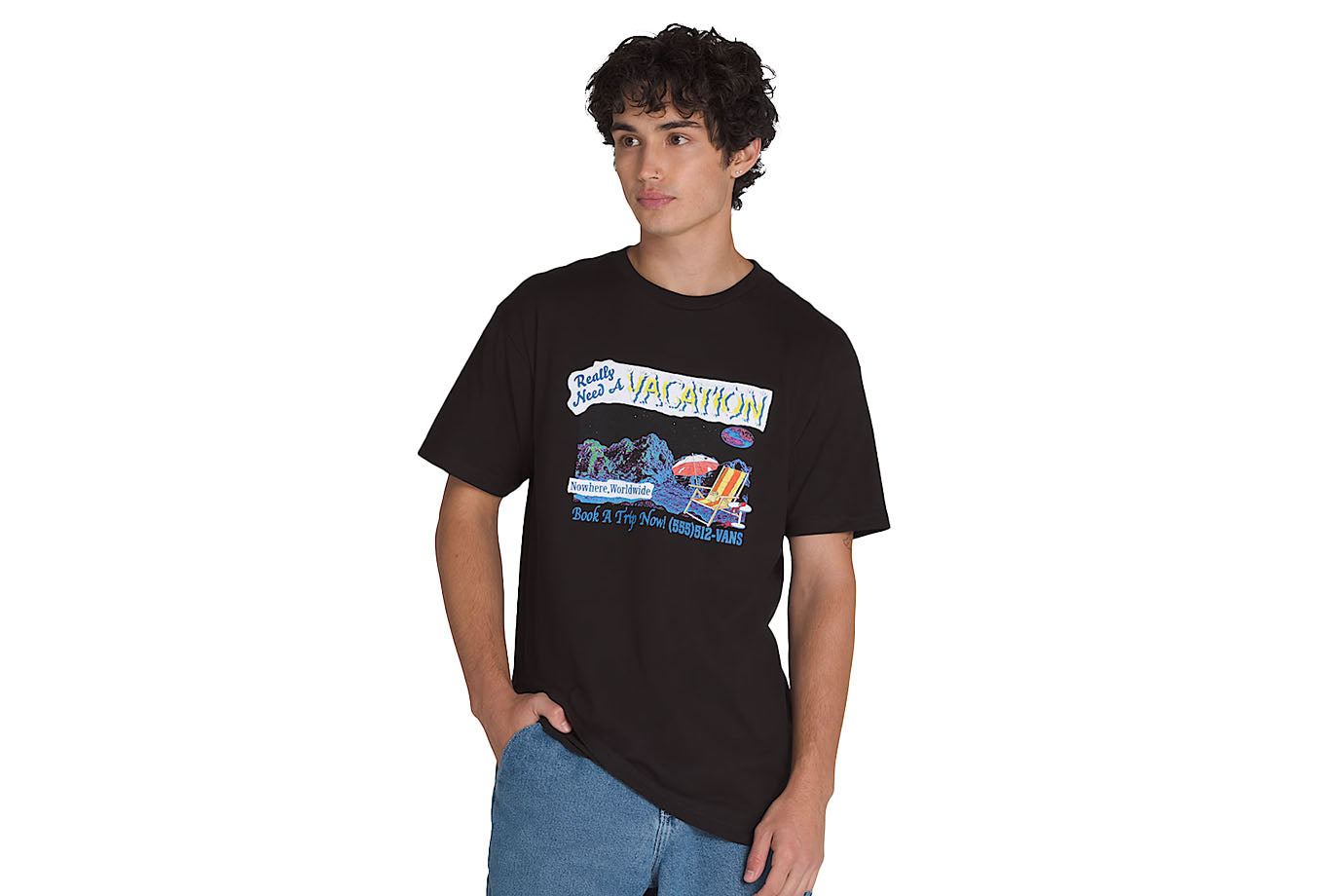 Take a break in the Need a Vacation T-Shirt, a classic fit short sleeve crew neck T-shirt with screenprinted graphics of a Vans®-style retro vacation ad on the back.