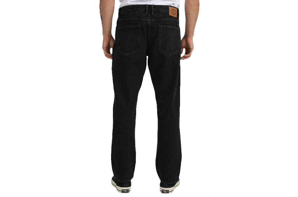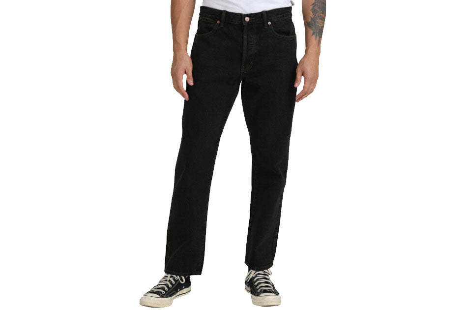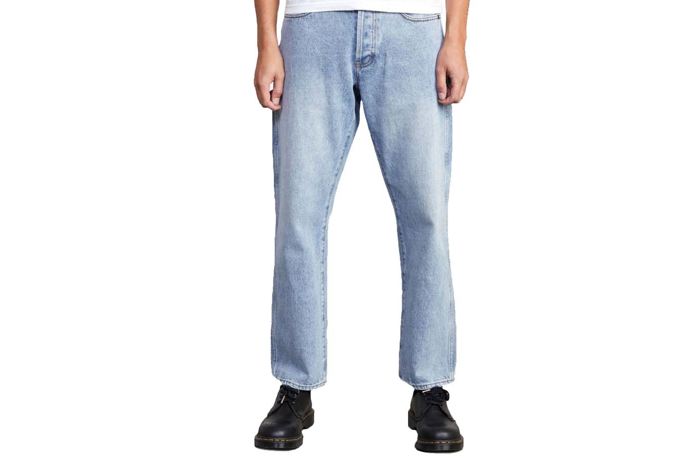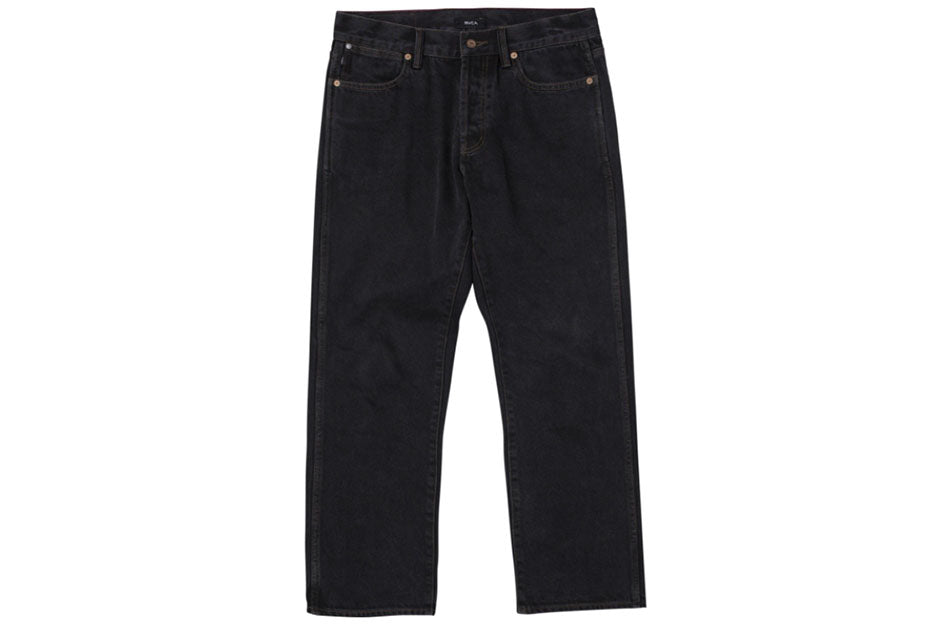 MODERN STRAIGHT FIT. MEDIUM RISE. SHORTENED INSEAM. BUTTON FLY AND WAISTBAND WITH RVCA SHANK. 5 POCKET STYLING WITH RVCA FLAG LABEL AT FRONT COIN POCKET. FLAT FELLED FINISHED OUTSEAMS. VA EMBROIDERY AT WEARERS RIGHT OUTSEAM. REVERSE CONSTRUCTED BELT LOOPS