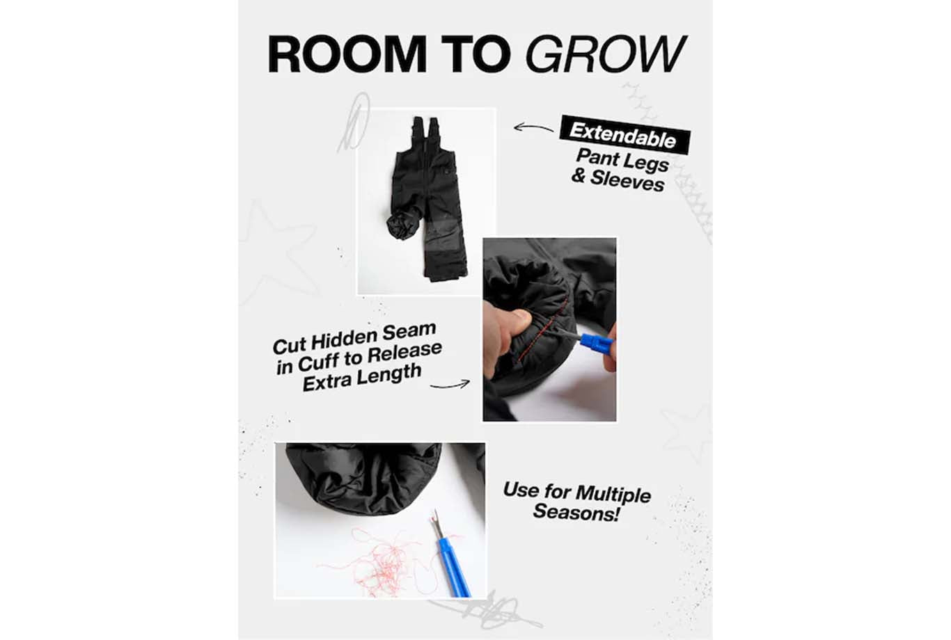 Room-to-Grow system extends the length of the legs and sleeves by 1.5in to keep up with growth spurts; Adjustable sleeve cuffs; Reflective details