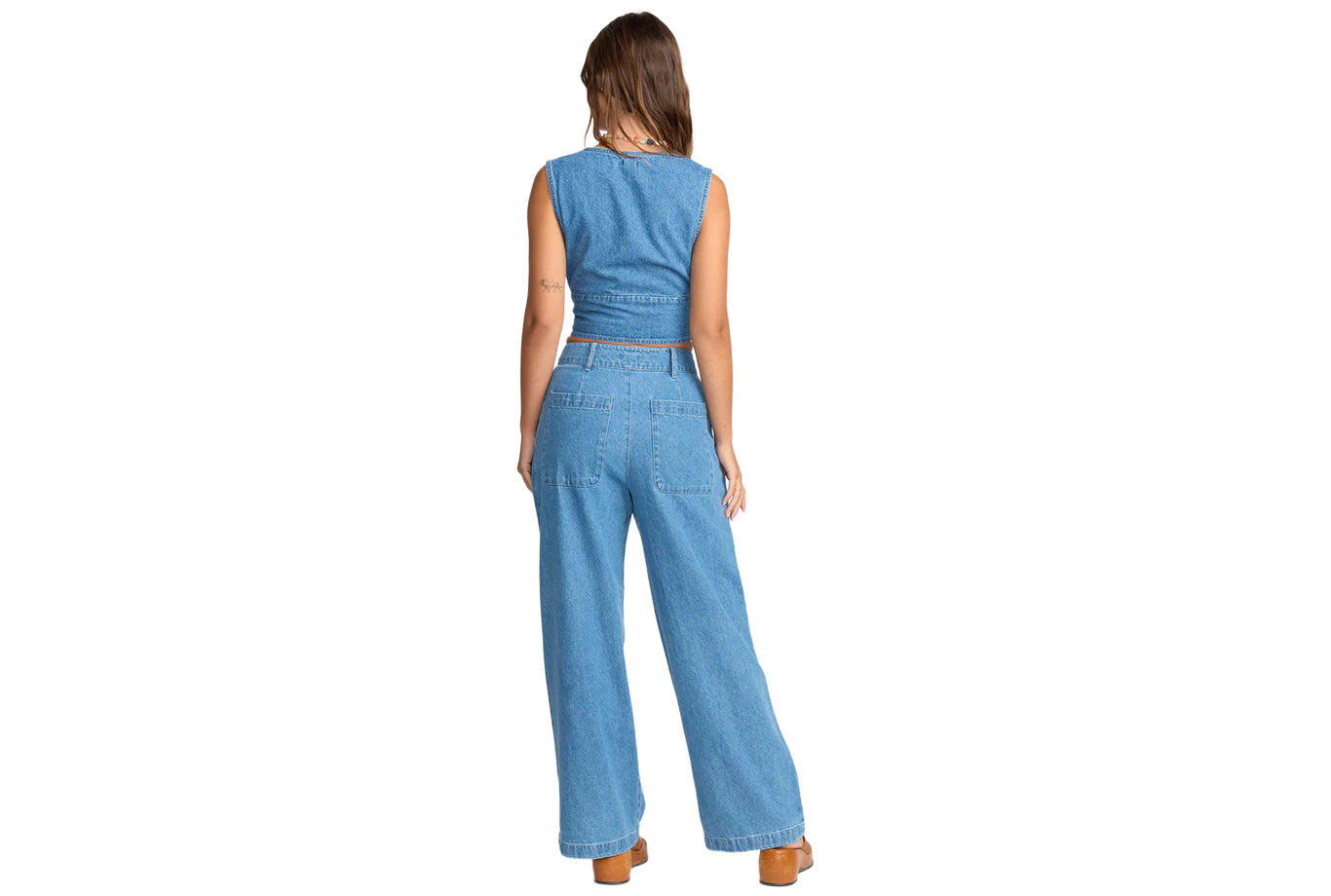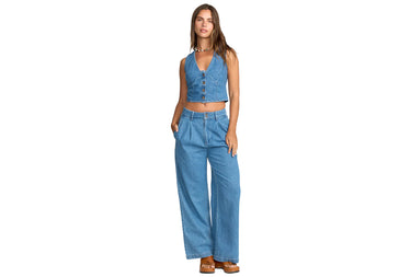 Dawn ride, coffee stop, rooftop hang-our Wave Washed Pants move with every dash. Soft cotton denim, fitted waist, button fly. Wide legs sweep the pavement, side and back pockets guard essentials through each rooftop leap. Featured here in the Salt Washed colorway.