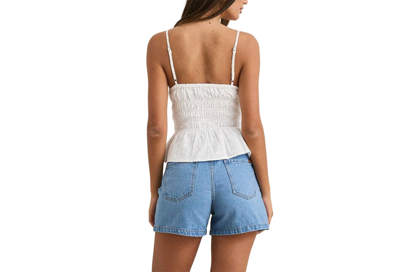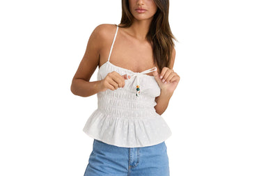 The Gigi Tie Front Top in White features a slim, flattering silhouette with a gathered front and adjustable tie. Finished with delicate resin bead details and flutter hem for a feminine touch.