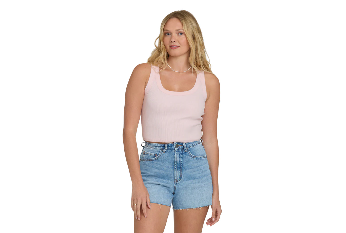 Meet the tank you end up wearing three days in a row without really meaning to. The Rerun Tank is a cropped, fitted knit made from soft, cotton-rich rib that hugs without feeling tight. Wide straps sit easy on your shoulders, the scoop neck shows just enough, and the stretch moves with you from coffee runs to coast drives. Offered in a lineup of sun-faded neutrals and soft color hits, it slips in with cutoffs, slouchy denim, or under an open shirt. Finished with a small flag label, it’s an Essentials Collection staple you’ll keep circling back to. Featured here in the Rosewater colorway.