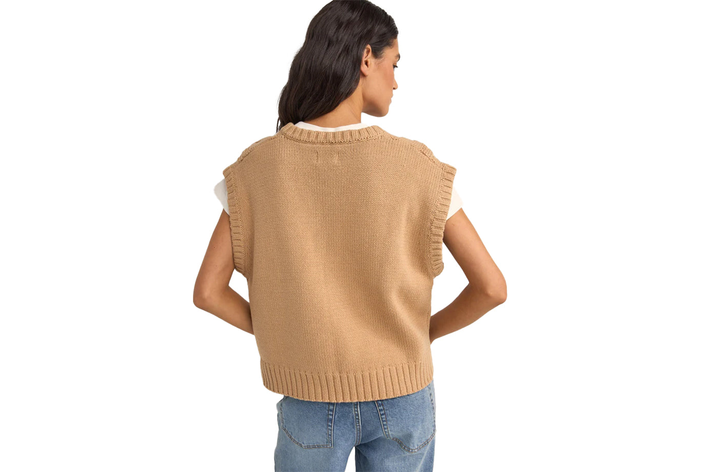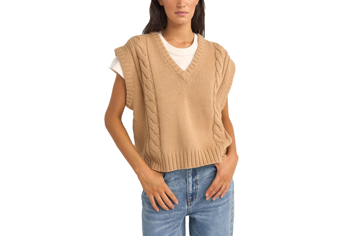 The Sand Finley Cable Knit Vest offers a soft, textured layer for your beach-inspired looks. The mid-weight chunky knit is crafted from cotton and acrylic, with its cable knit design, slouchy v neck and oversized fit adding warmth and style that weaves the intricate beauty of coastal landscapes in every stitch.