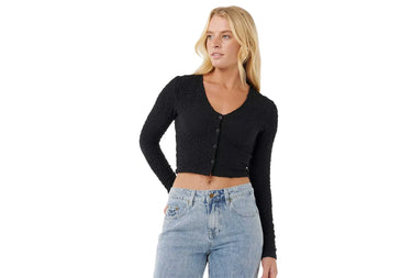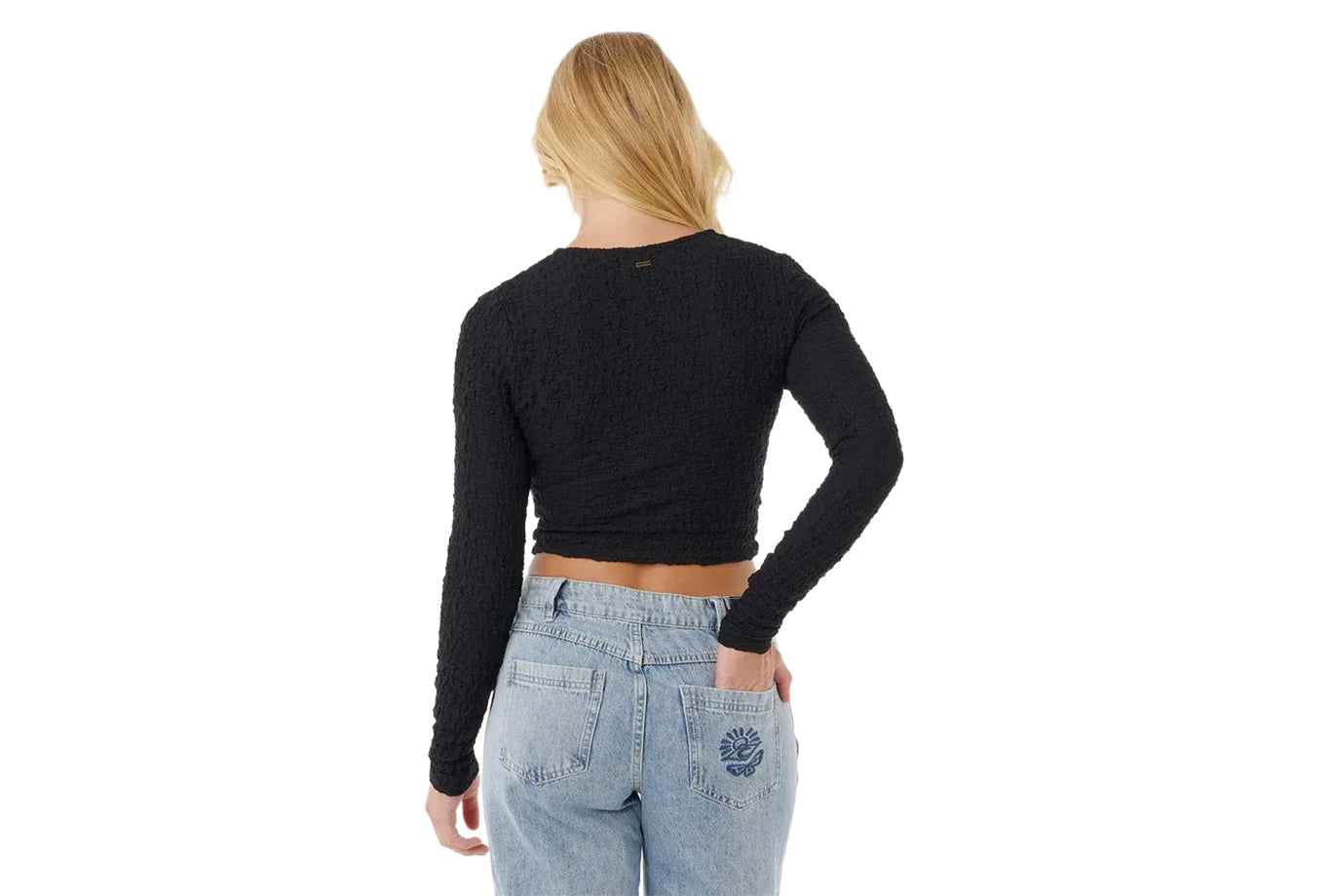 The Sunset Luau Texture Long Sleeve Tee is a fitted essential with subtle texture, contrast stitching, and a delicate button-up detail at the neckline. A go-to for layering post-surf or dressing up laid-back afternoons.