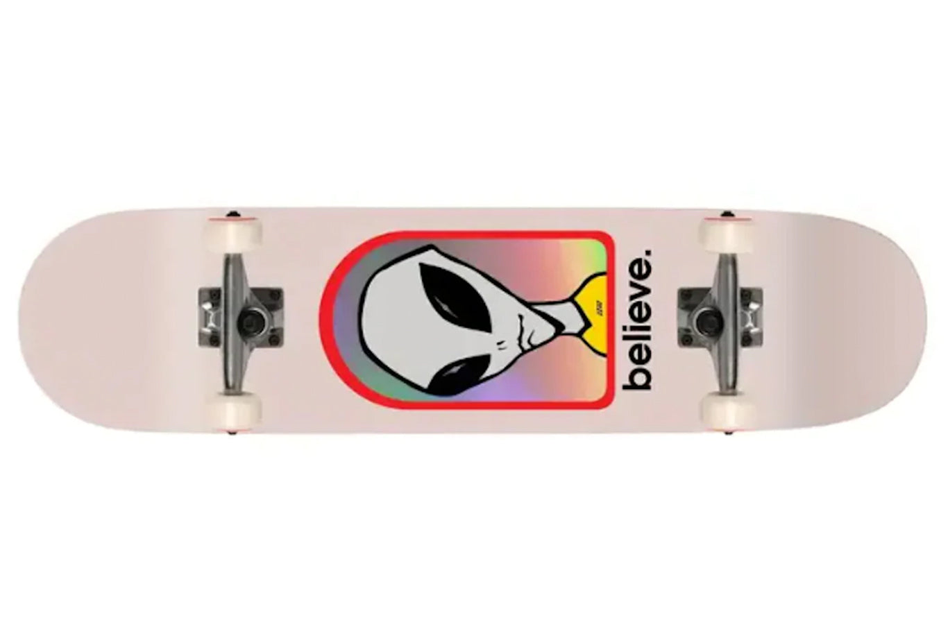 tart rollin through the streets with the Alien Workshop Believe Hologram Complete. This is a high quality complete that's perfect for beginning skateboarders for those on a budget and smaller riders just starting out. Features a top quality Alien Workshop 7-ply maple deck, Alien Workshop 53mm wheels, abec 7 shielded bearings, Alien Workshop die cut griptape and standard phillips hardware. Comes fully assembled and ready to ride straight out of the box.