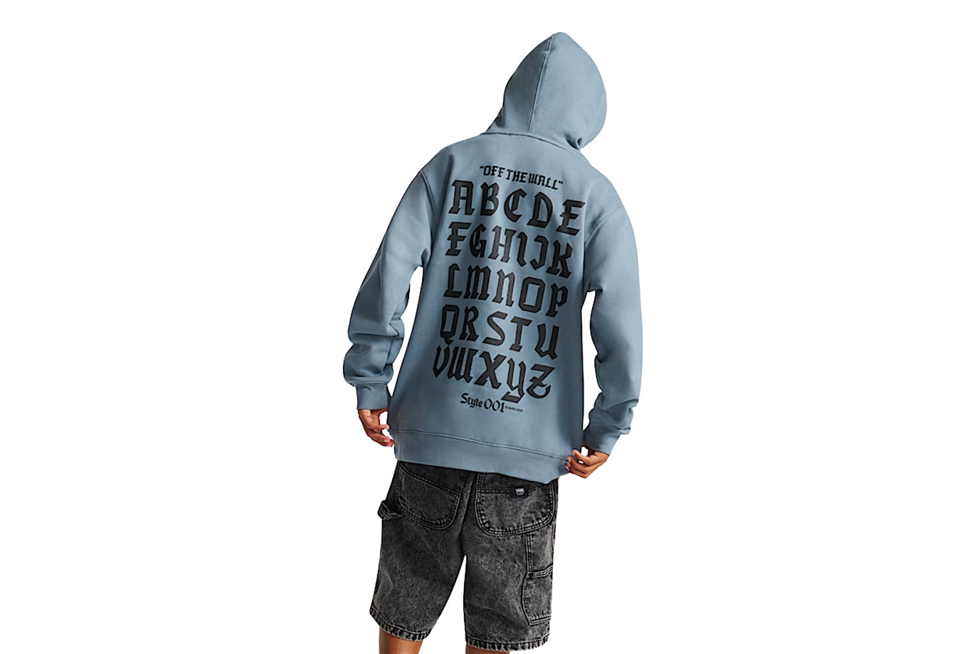 The Style 001 Pullover Hoodie combines an effortless pullover design with a soft brushed interior for comfort and warmth. With a front kanga-style pocket, it's finished with screen print artwork for a long-lasting design featuring a stylized Vans logo on the front, and an Off the Wall scripted alphabet chart on the back. Wear it solo or atop other layers for additional protection from the elements.