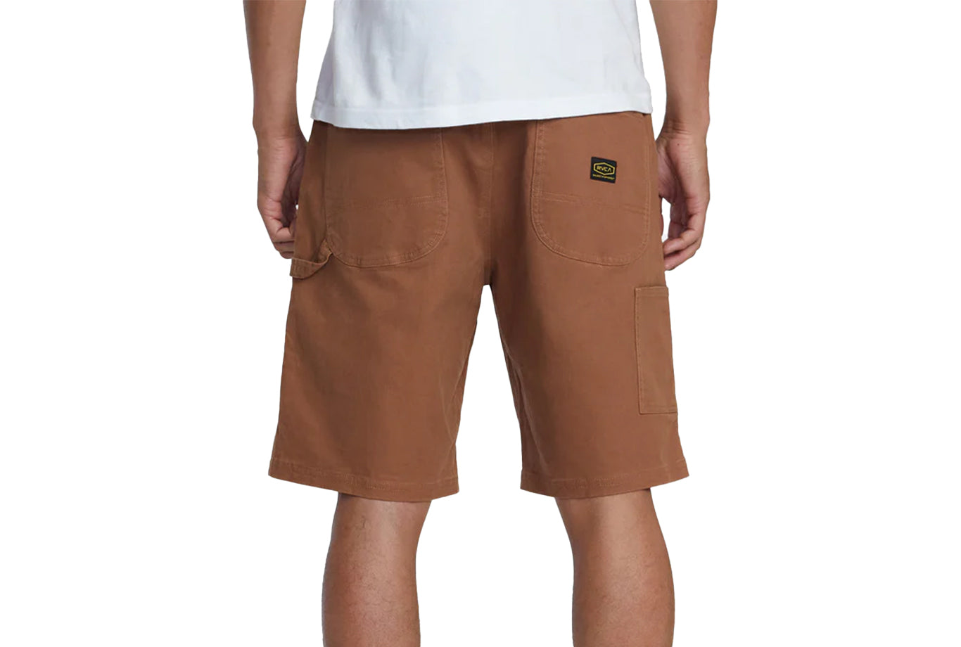 Experience RVCA's Dayshift Collection Americana 17" Carpenter Shorts, crafted from blended cotton fabric with a heavy enzyme wash for superior softness. These workwear shorts offer a regular fit, faux fly, and elastic waist with drawcord closure, plus side and back pockets for bonus functionality.