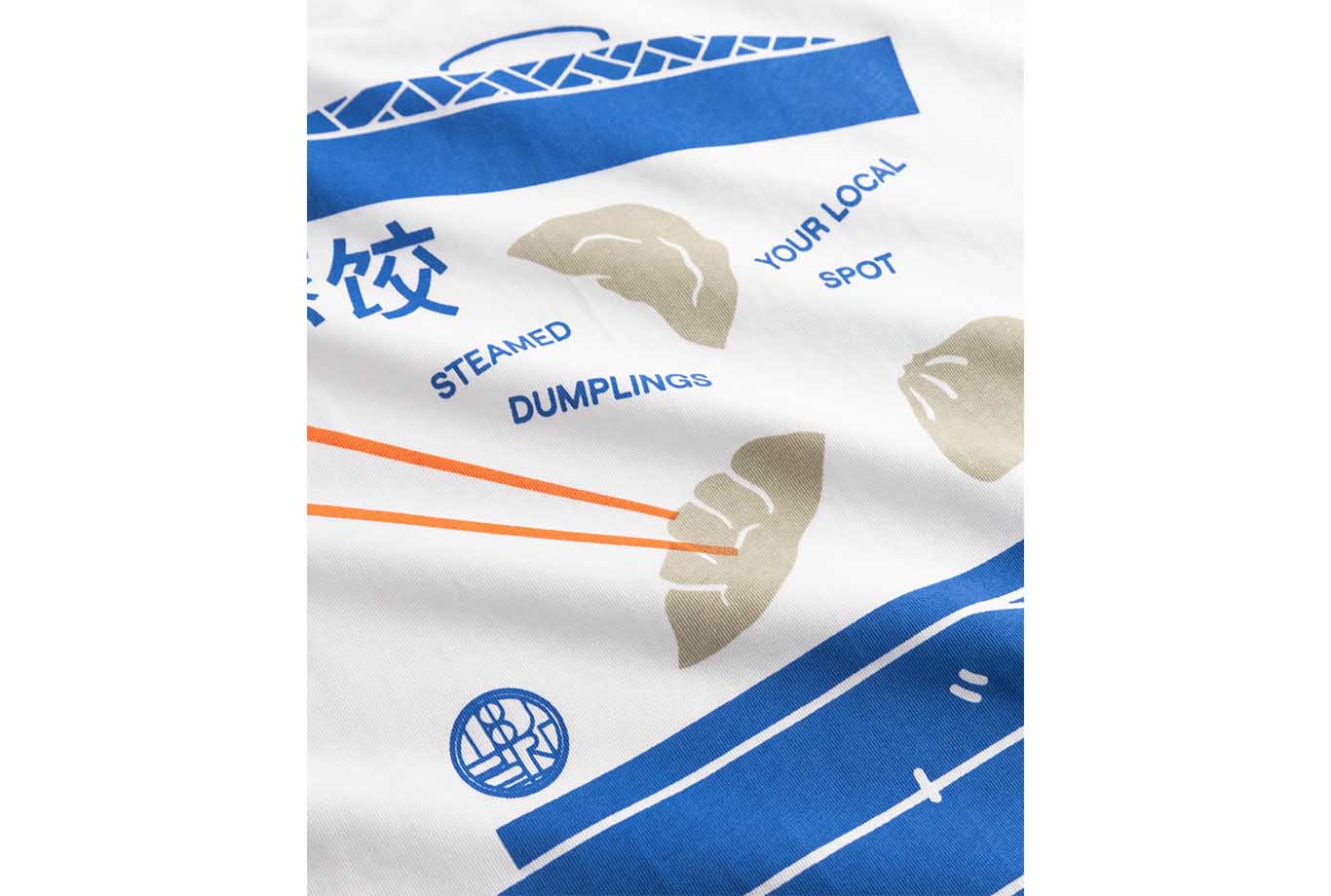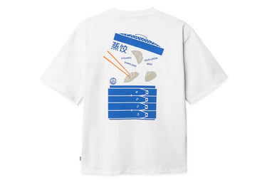 Casual fit tee with a relaxed silhouette and a classic crew neckline. The back features a large graphic with dumplings, chopsticks, and stacked steamers, while a small chest print keeps the front minimal. Straightforward shape with a playful graphic moment.