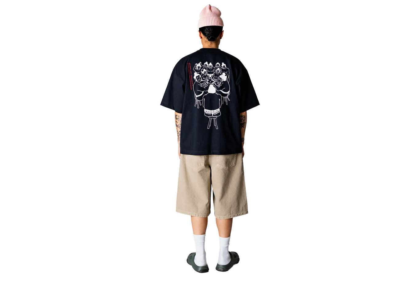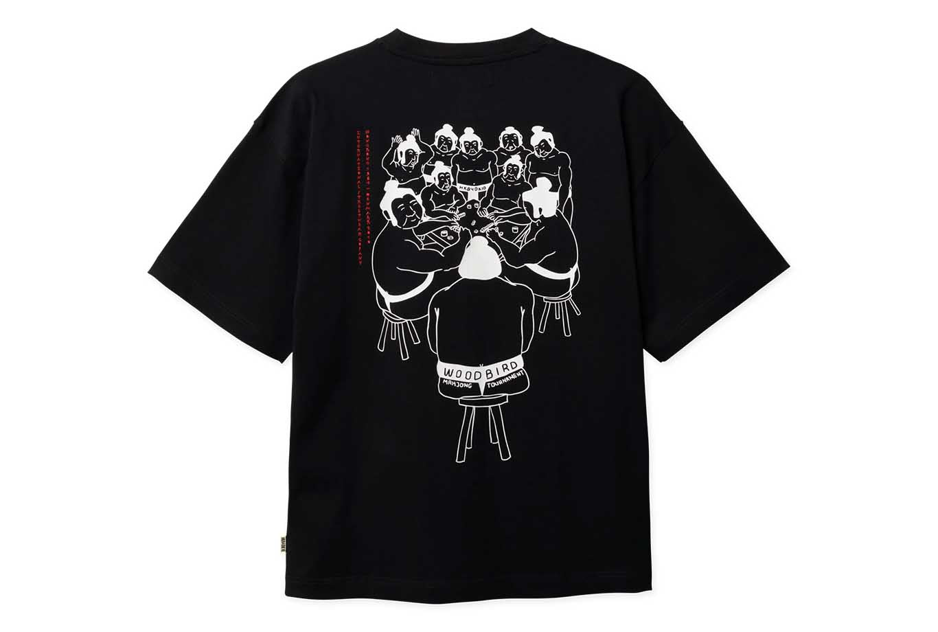 Boxy fit T-shirt with a relaxed silhouette and a classic crew neckline. The back features a large illustrated graphic of a mahjong table scene with Sumo Wrestlers, while the front keeps things minimal with a small print.