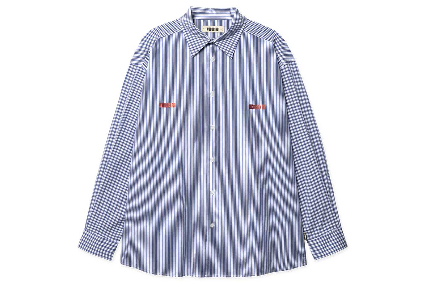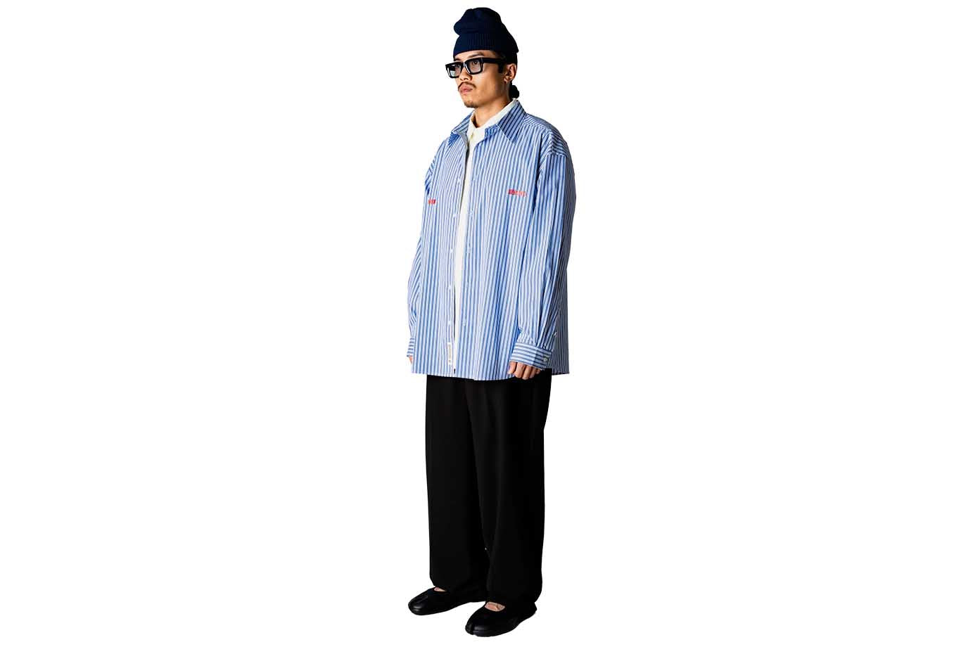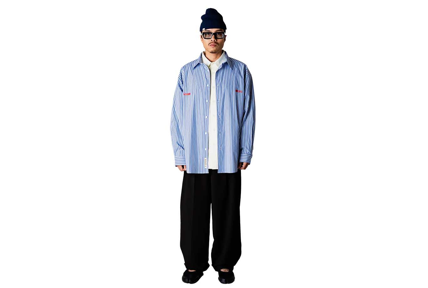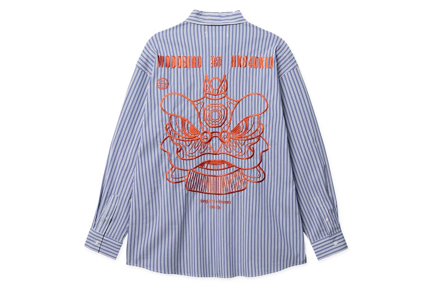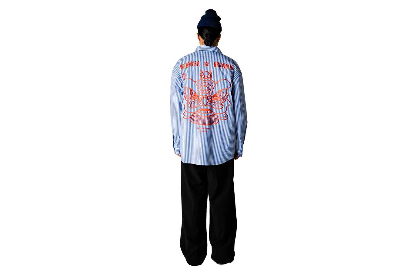 Loose fit shirt with a relaxed, slightly boxy silhouette. Features a classic collar, full button front, and long sleeves with buttoned cuffs. The fabric has vertical stripes, while the front and back include embroidered graphic of a lion dance mask.