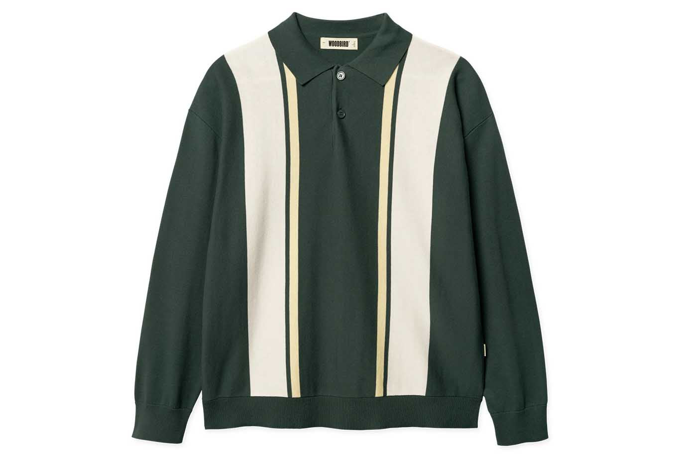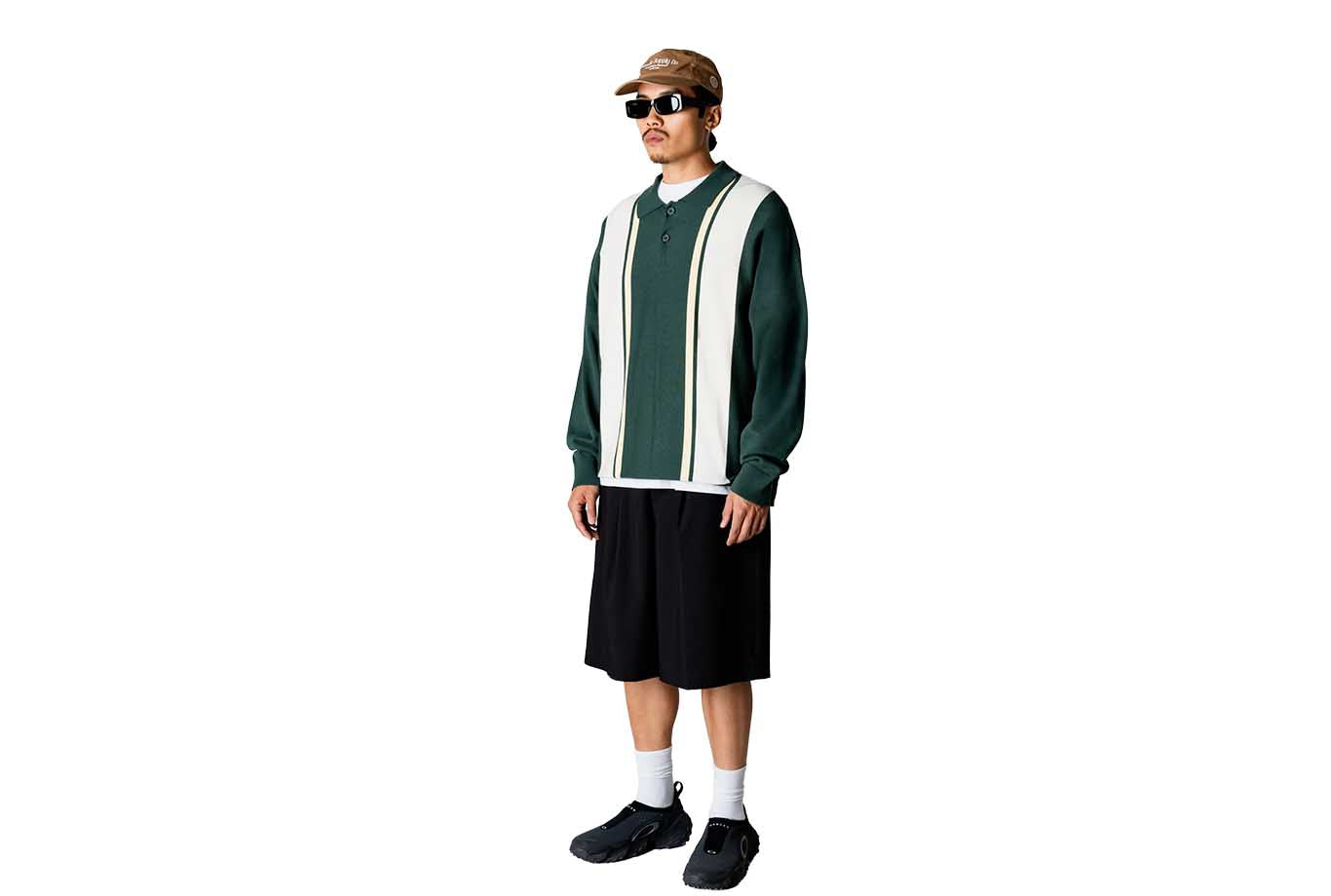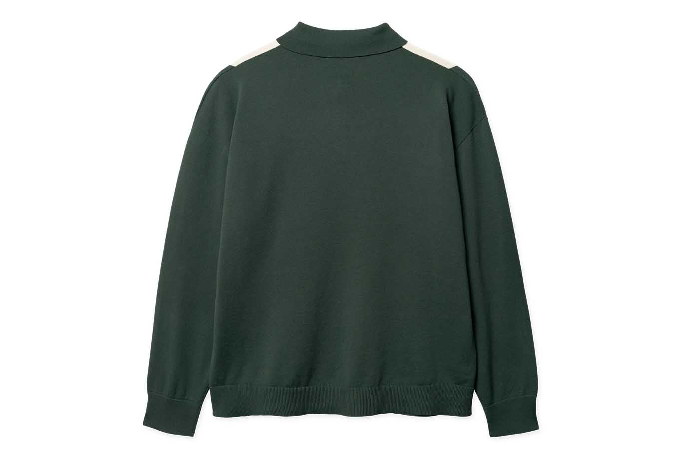 Casual fit knitted polo with a classic polo collar and button placket. Knit construction with vertical panel detailing on the front and a clean back. Finished with ribbed cuffs and hem. A straightforward piece with a slightly structured look.