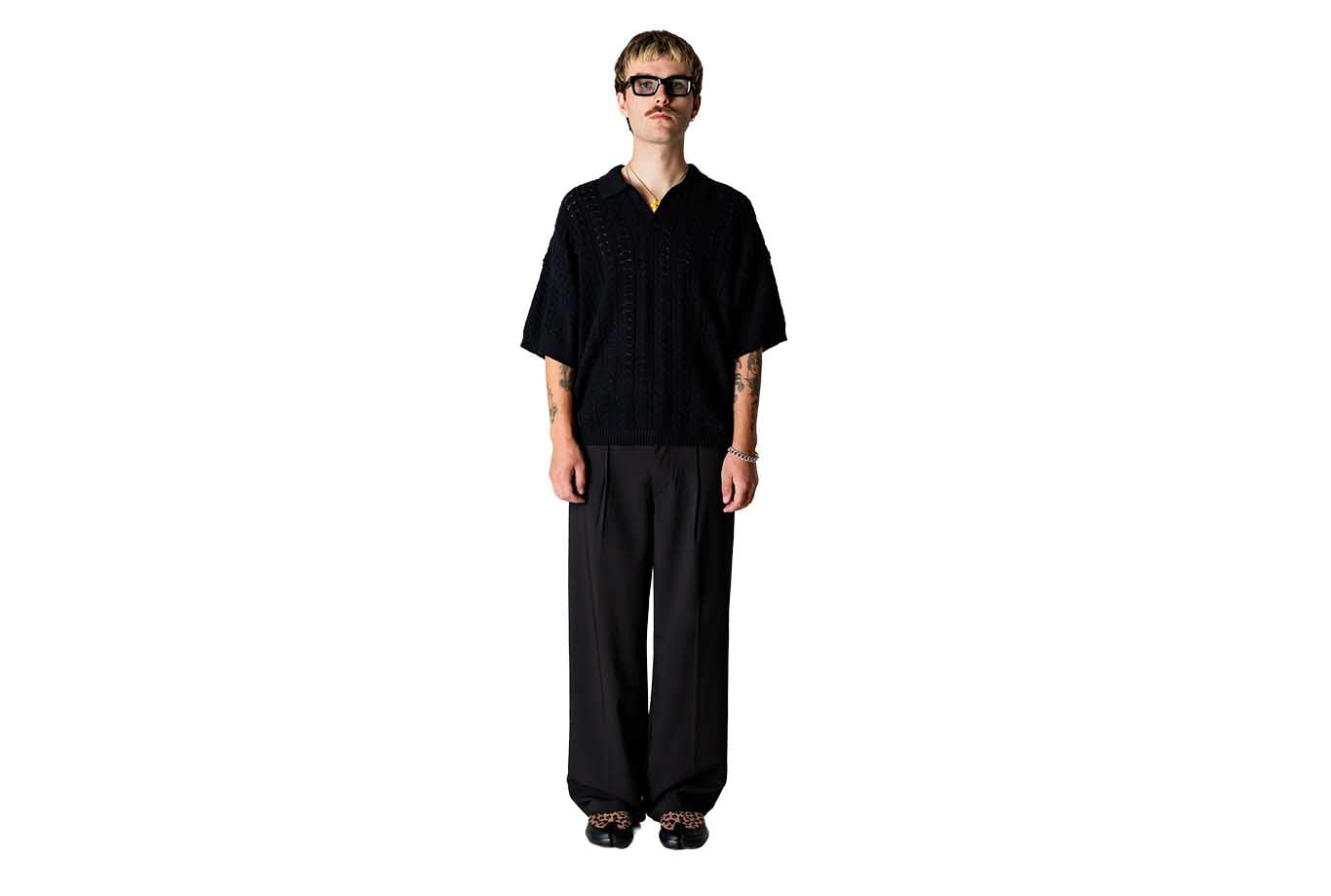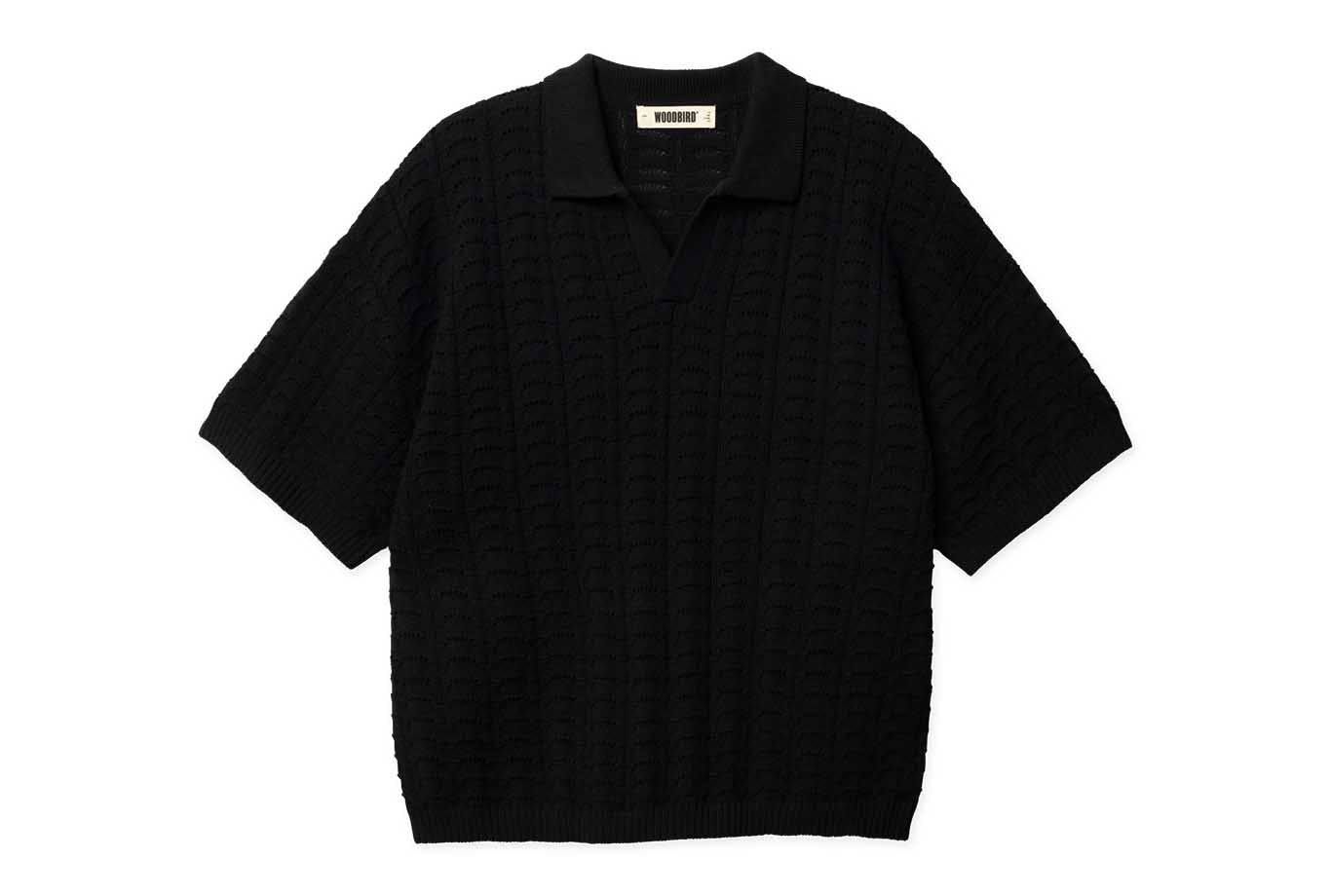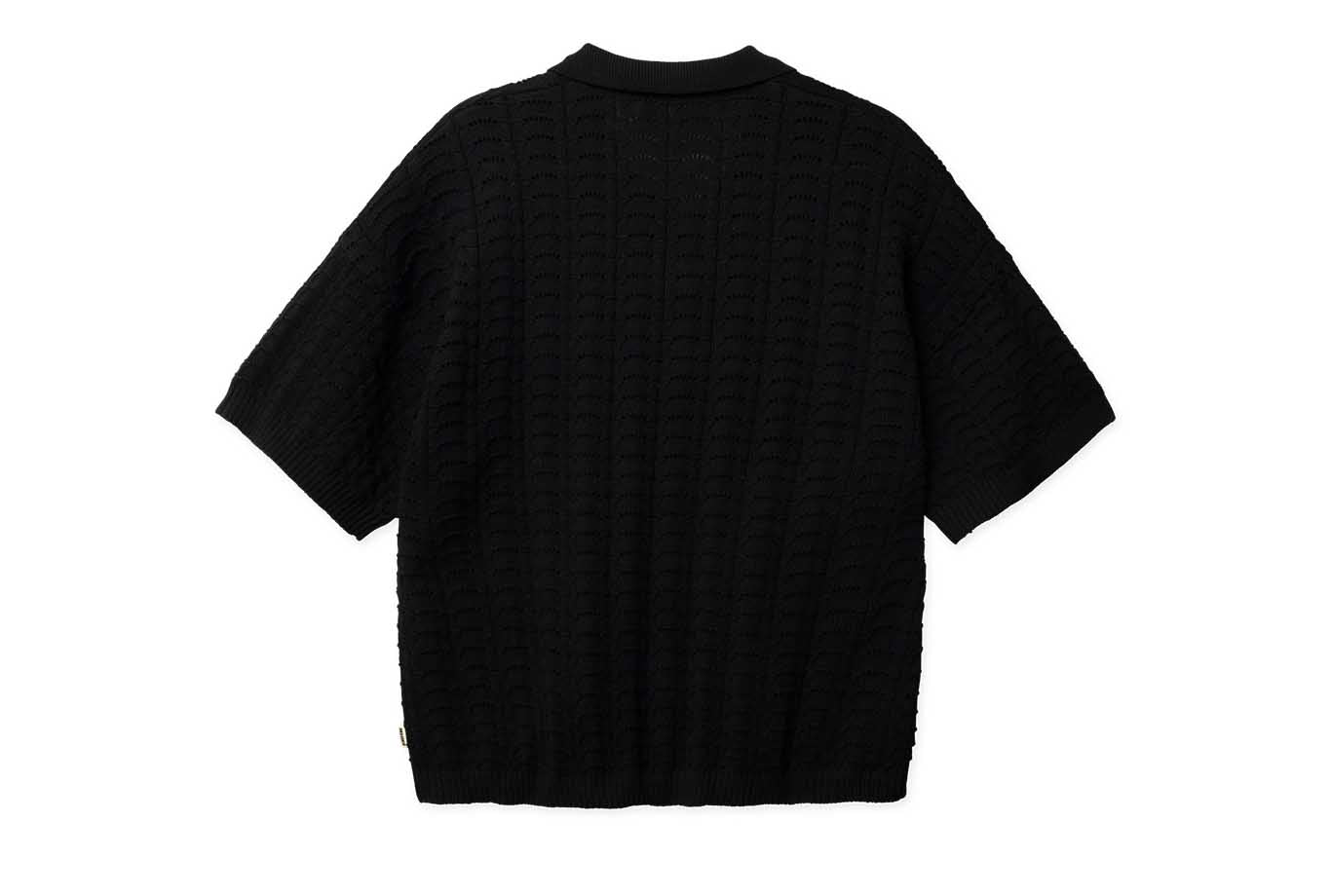 Loose fit knit polo with a relaxed, slightly boxy silhouette. Features a soft polo collar and open neckline. The knit construction forms vertical textured patterns across the surface, giving the shirt a breathable structure and subtle depth.