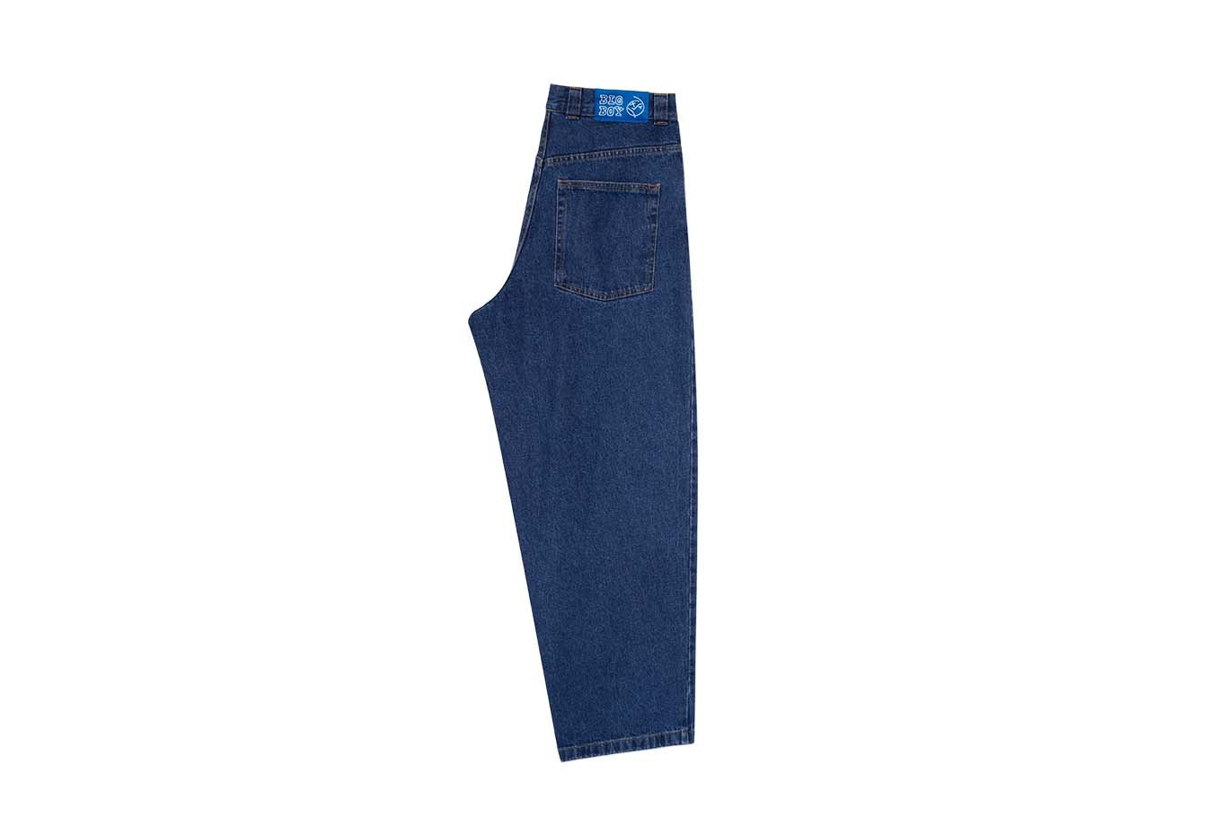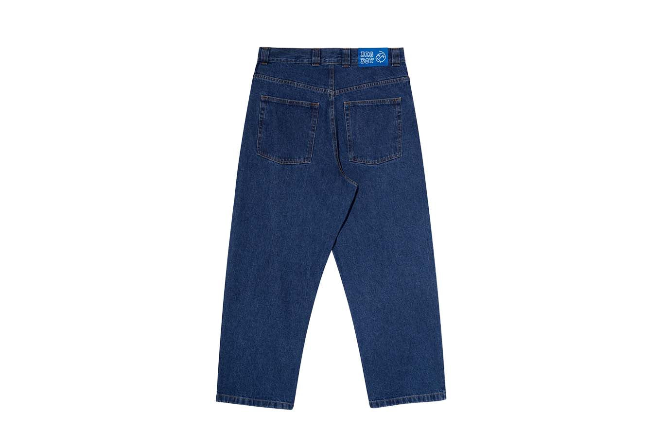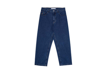 Low-waisted baggy jeans with tapered legs. Made from 100% dark blue cotton denim with a heavyweight 435 gsm feel. Features a YKK zipper, custom YKK button, and embroidered detail on the change pocket. Finished with a woven label on the waist.