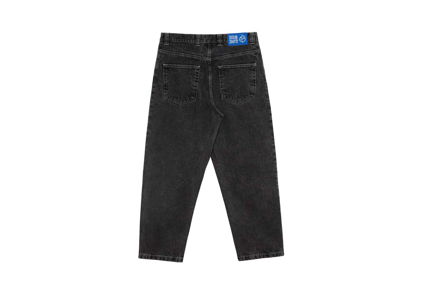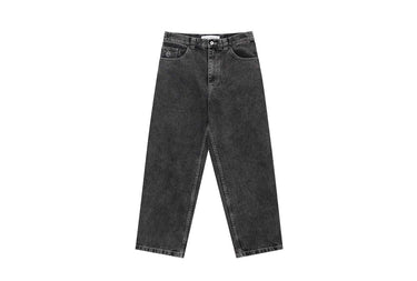 Low-waisted baggy jeans with tapered legs and a relaxed fit. Made from 100% silver black cotton denim. Features a YKK zipper, custom YKK button, and embroidered detail on the coin pocket. Finished with a woven label on the waist.