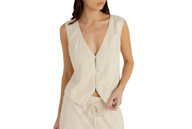 The Cove Vest in Oat offers a tailored fit with princess seams and a spaghetti tie at the back. Perfect for layering with a touch of elegance.