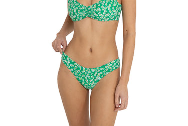 The Evergreen Floral Holiday Pant in Green provides moderate coverage with a mid-rise fit. Crafted from recycled polyamide and elastane with a custom hand-drawn print, it features wide side seams and clean finished edges. With intricate zigzag stitch details, this pant is a stylish choice suited for sunlit gatherings that go soft on the environment.