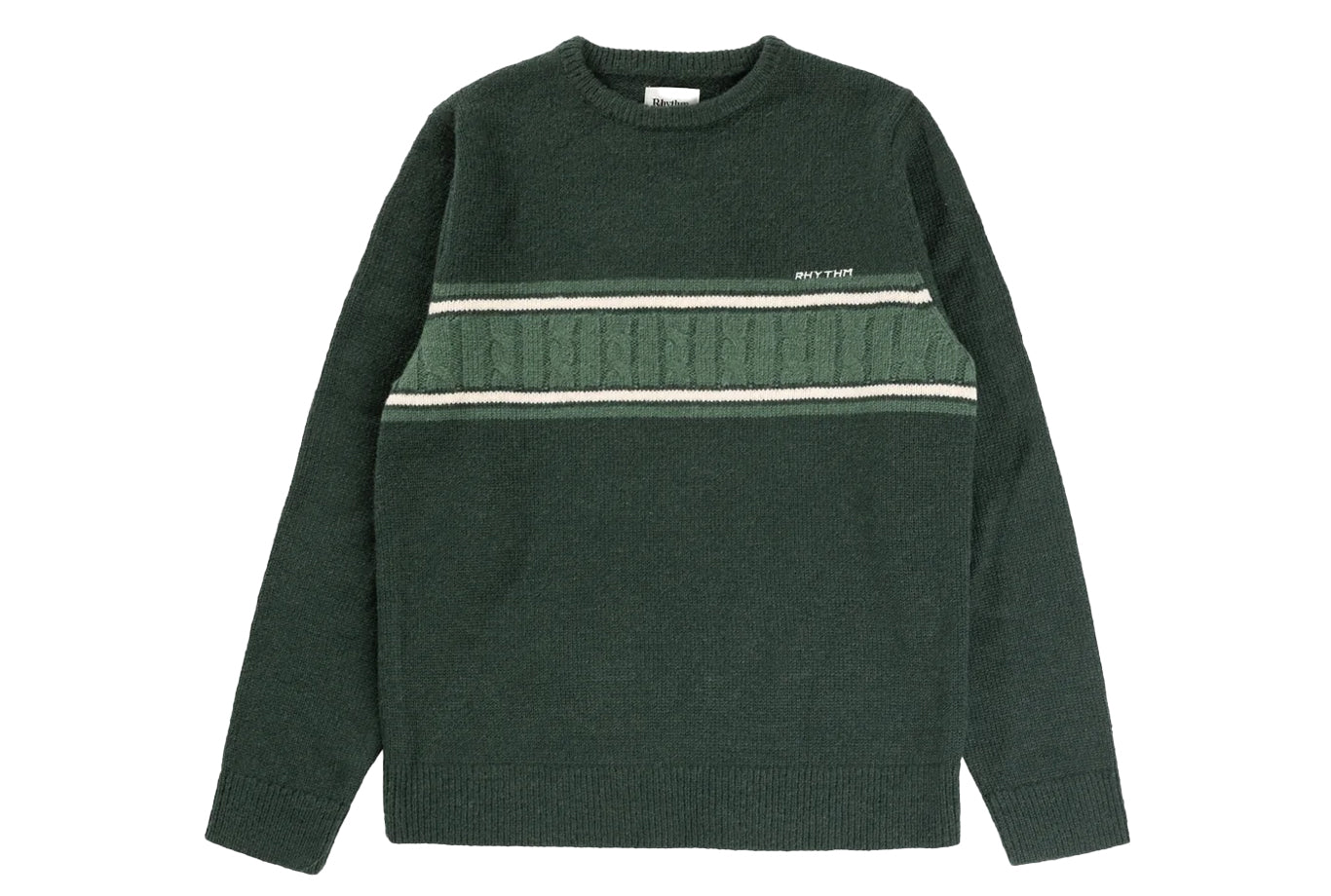 The Mohair Stripe Knit, at 420g and composed of 47% acrylic, 30% nylon, 15% wool, and 8% mohair, is a warm, stylish layer and incredibly versatile layer. With an oversize fit, cable knit stripe, ribbed collar, and Rhythm logo embroidery, it adds texture and colour to any outfit.