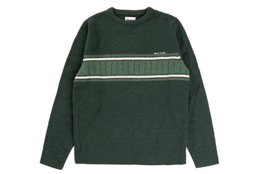 - OVERSIZE FIT, CABLE KNIT STRIPE, RIBBED COLLAR, SLEEVE CUFFS, & BODY HEM, LOGO EMBROIDERY
