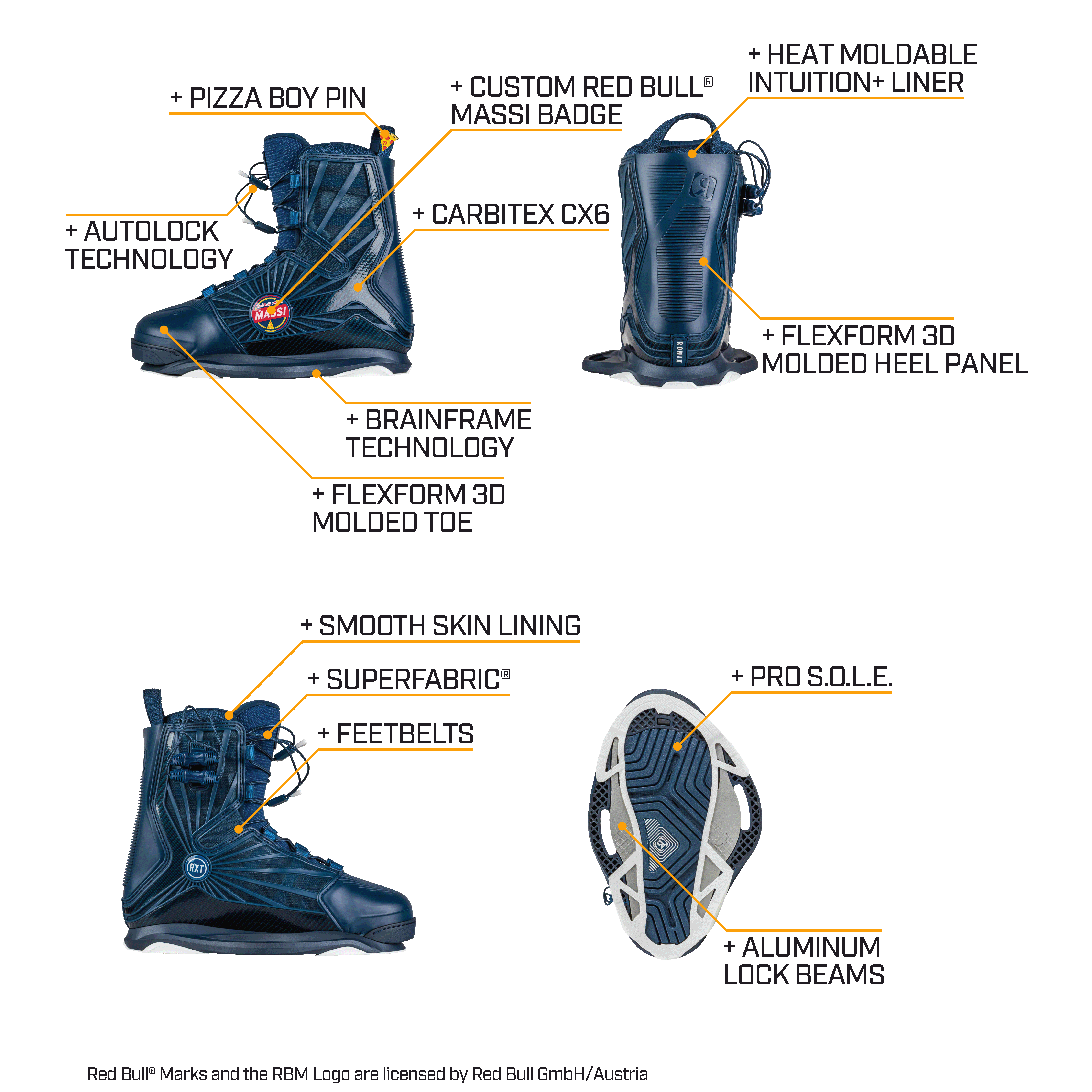 Teaming up with Red Bull and Massi Piffa, the 2022 RXT Boot is a special collaboration between wakeboarding’s most stylish rider and the energy drink powerhouse. The design driven RXT boot offers wide windows for enhanced mobility and weight savings while enclosing the heel and toe with our proprietary FlexForm material for greater flexibility and control. A custom designed logo highlighting Massi’s larger than life personality and love for his home country, Italy.