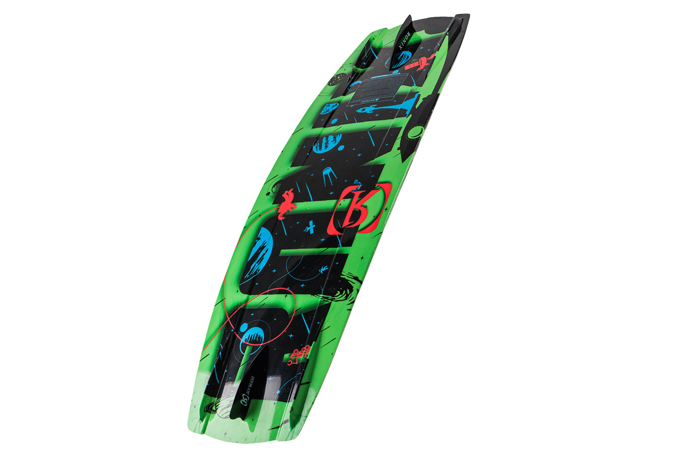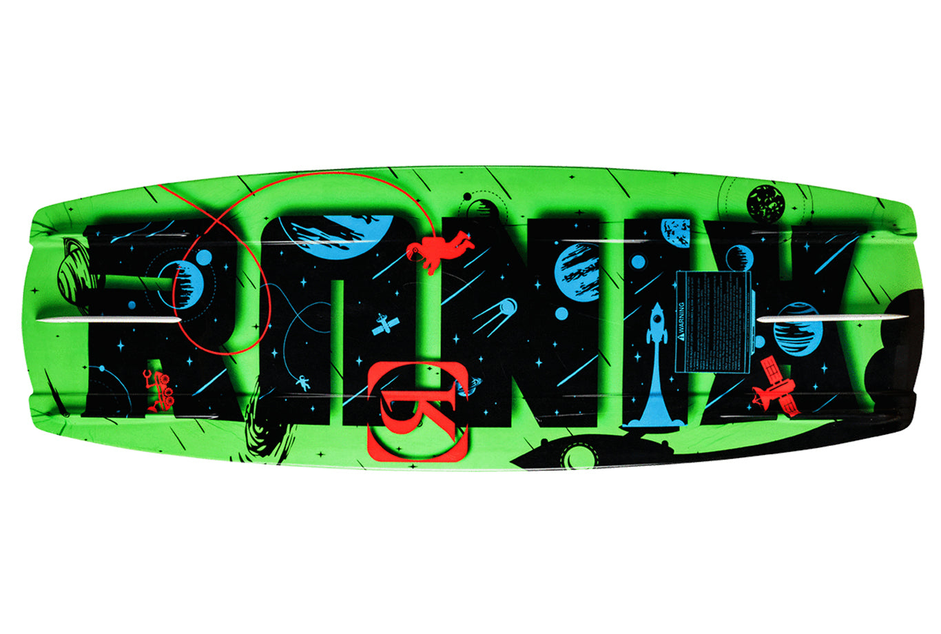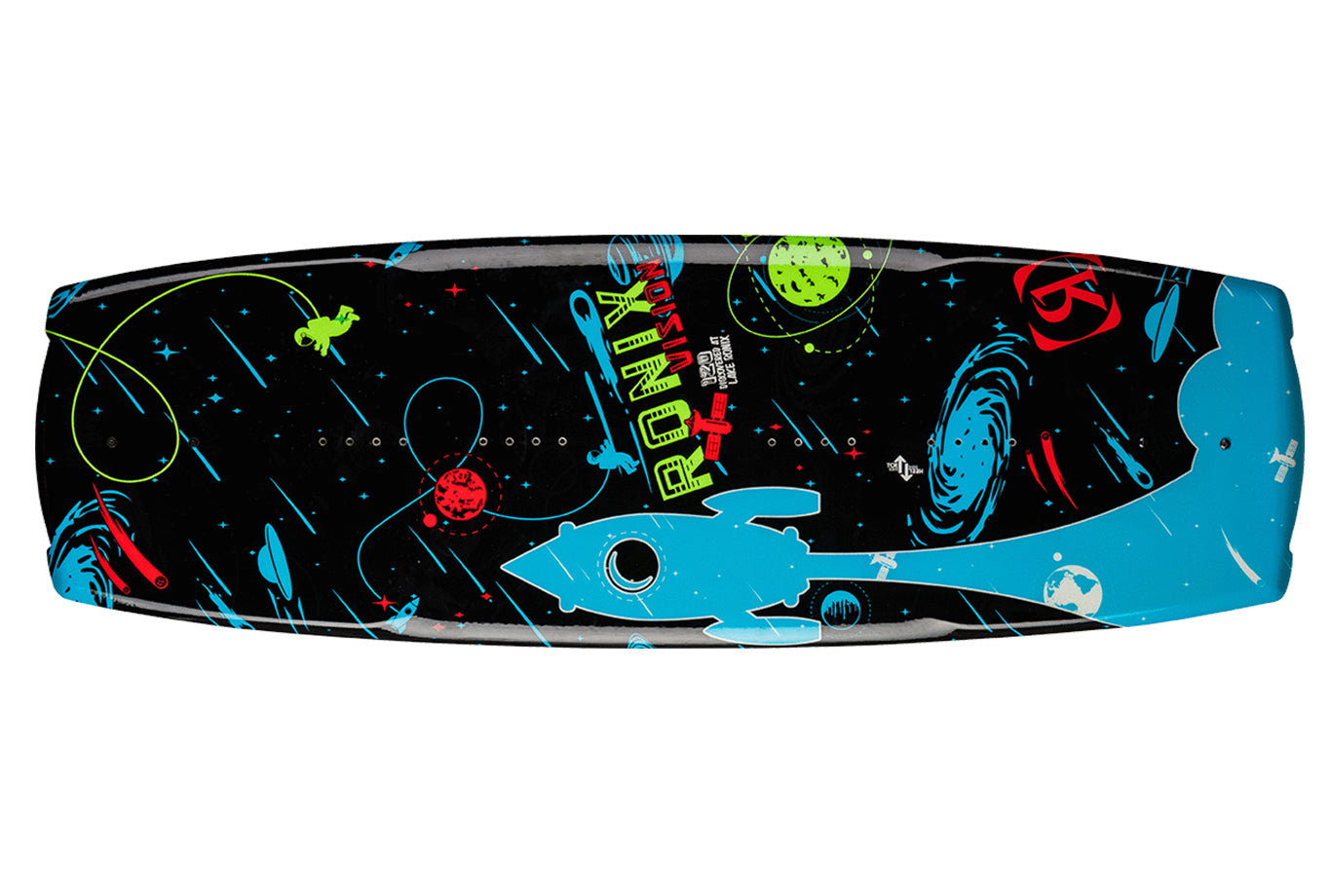 Every aspect of this kid’s shape/construction was designed for stability and progression. Designed and created by the grom’s modern prospect, recognizing that wakeboarding is the only board sport where your hips and shoulders aren’t parallel. A symmetrical shape with asymmetric features designed solely for the needs of the next generation of rippers. Your body is in an unbalanced position edging into the wake toeside, so we created a thinner, sharper rail to help set an easier, more confident edge. Then on your heelside your body is more comfortable in an aligned position, so we added a fuller vertical rail to generate more top water speed over the water. Come into the wake flat without much edge hold? No worries, we have more volume in the ends to help generate natural lift off the wake. Our Grom Glass offers a lighter layup for more feel with the water, and less swing weight in the air. A rockerline designed to assist a rider in a relaxed, neutrally balanced position. Flip the lights off and check out the glow in the dark images of the Vision.