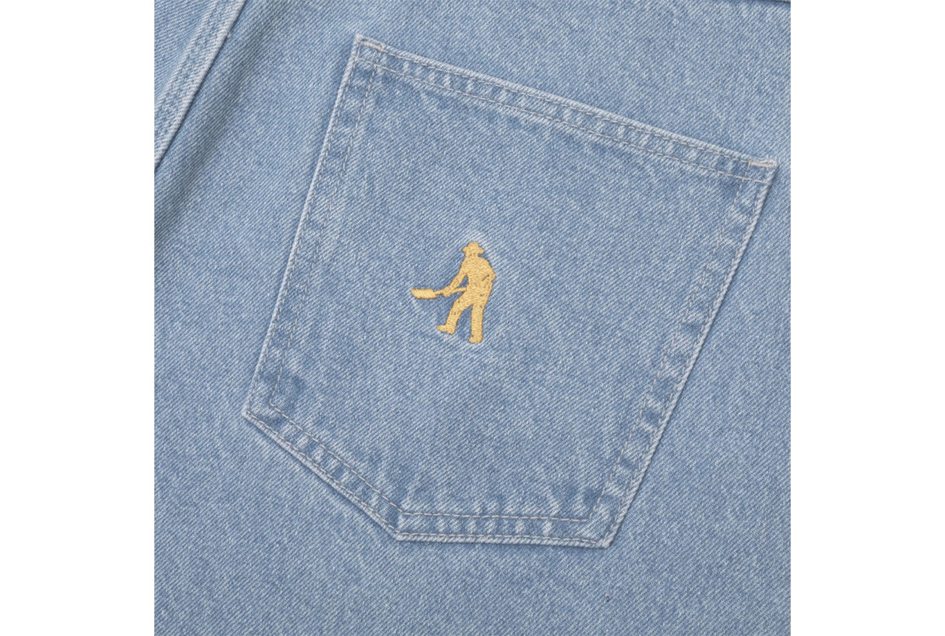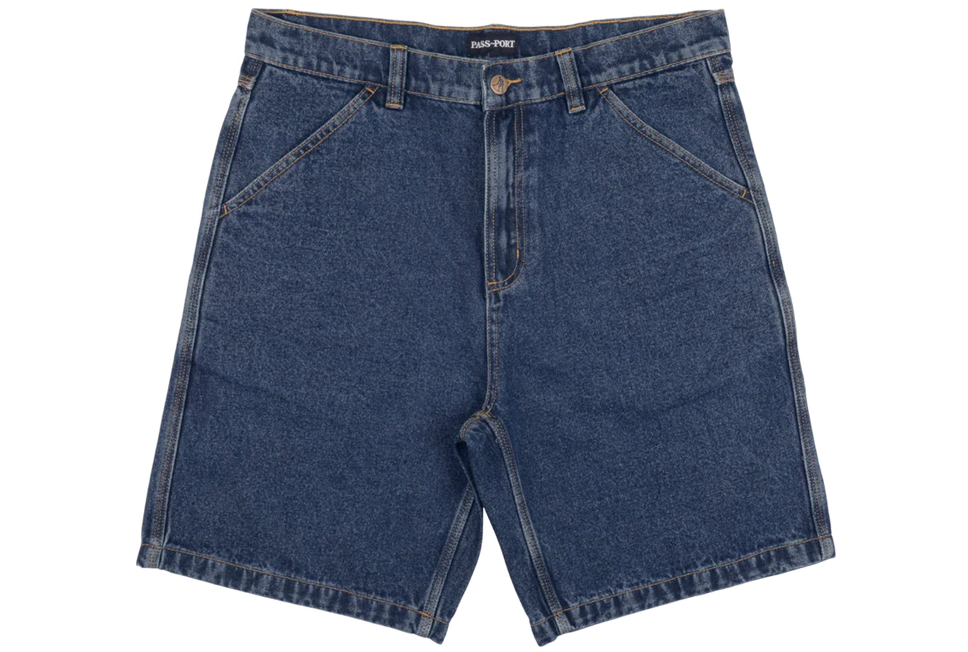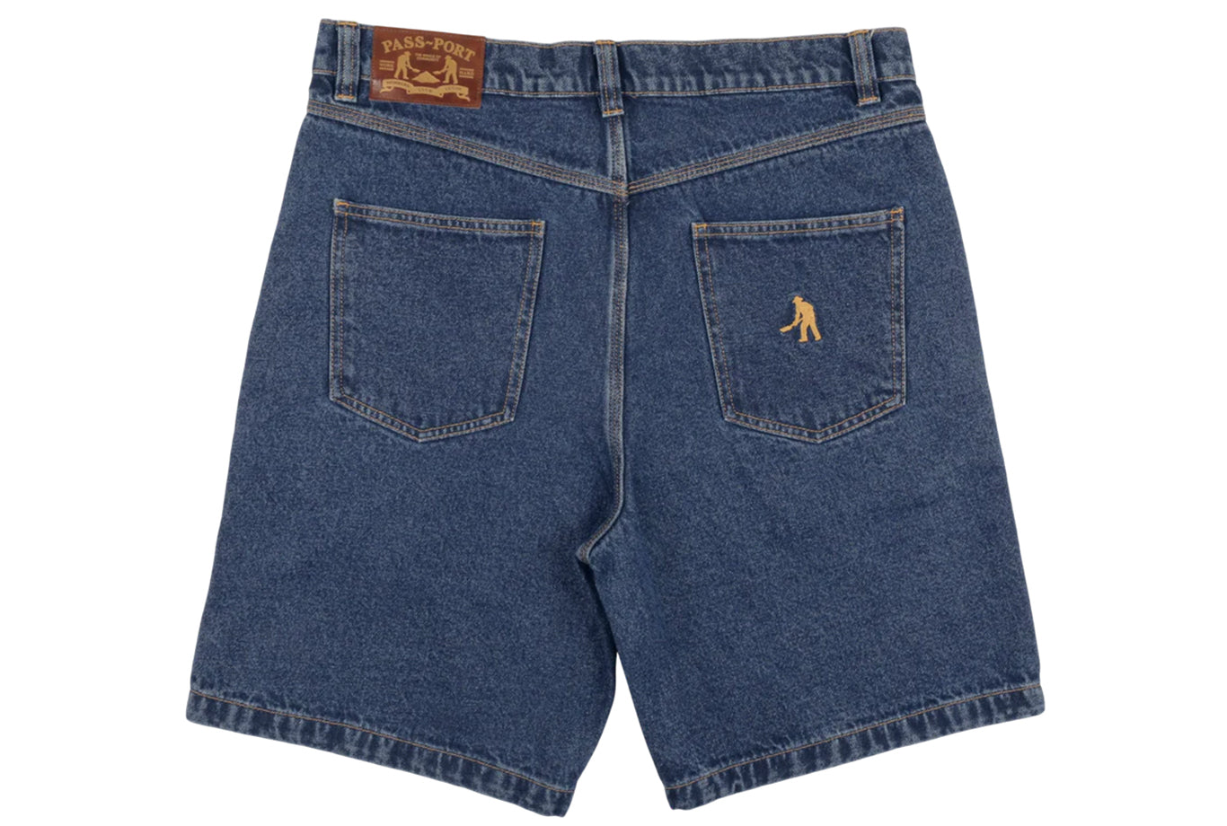 Pass~Port Workers Club denim short in washed black from range #44. The Workers denim short is made from 100% cotton 16oz rigid denim and fine yarn for extra strength. The jort features brown contrast stitching, digger embroidery on back pocket as well a faux leather label on waist.