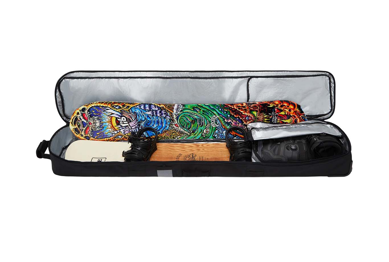 - Holds 2 snowboards (1 with bindings mounted), 1 pair of boots, and outerwear