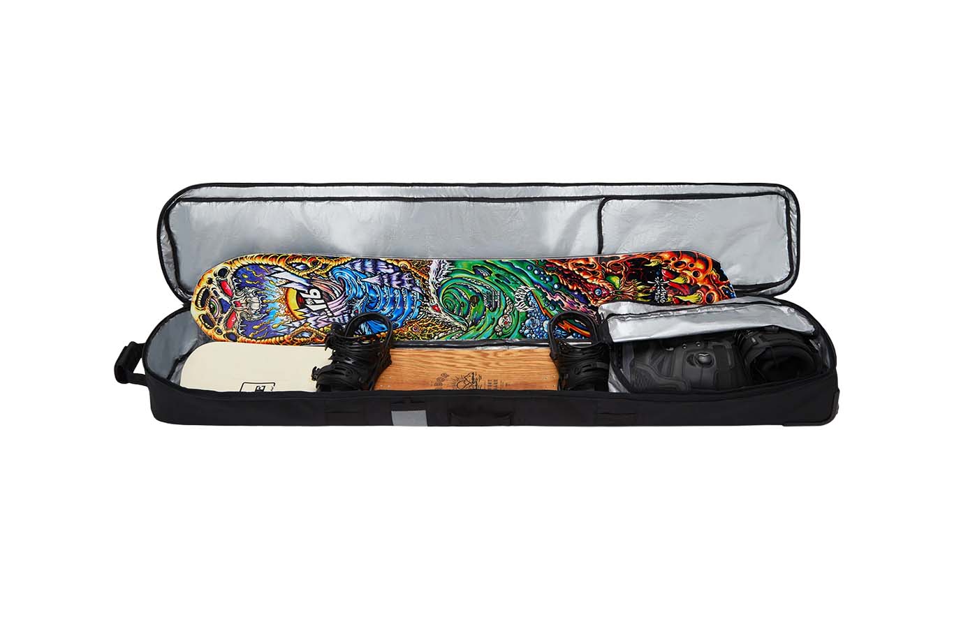 - Holds 2 snowboards (1 with bindings mounted), 1 pair of boots, and outerwear