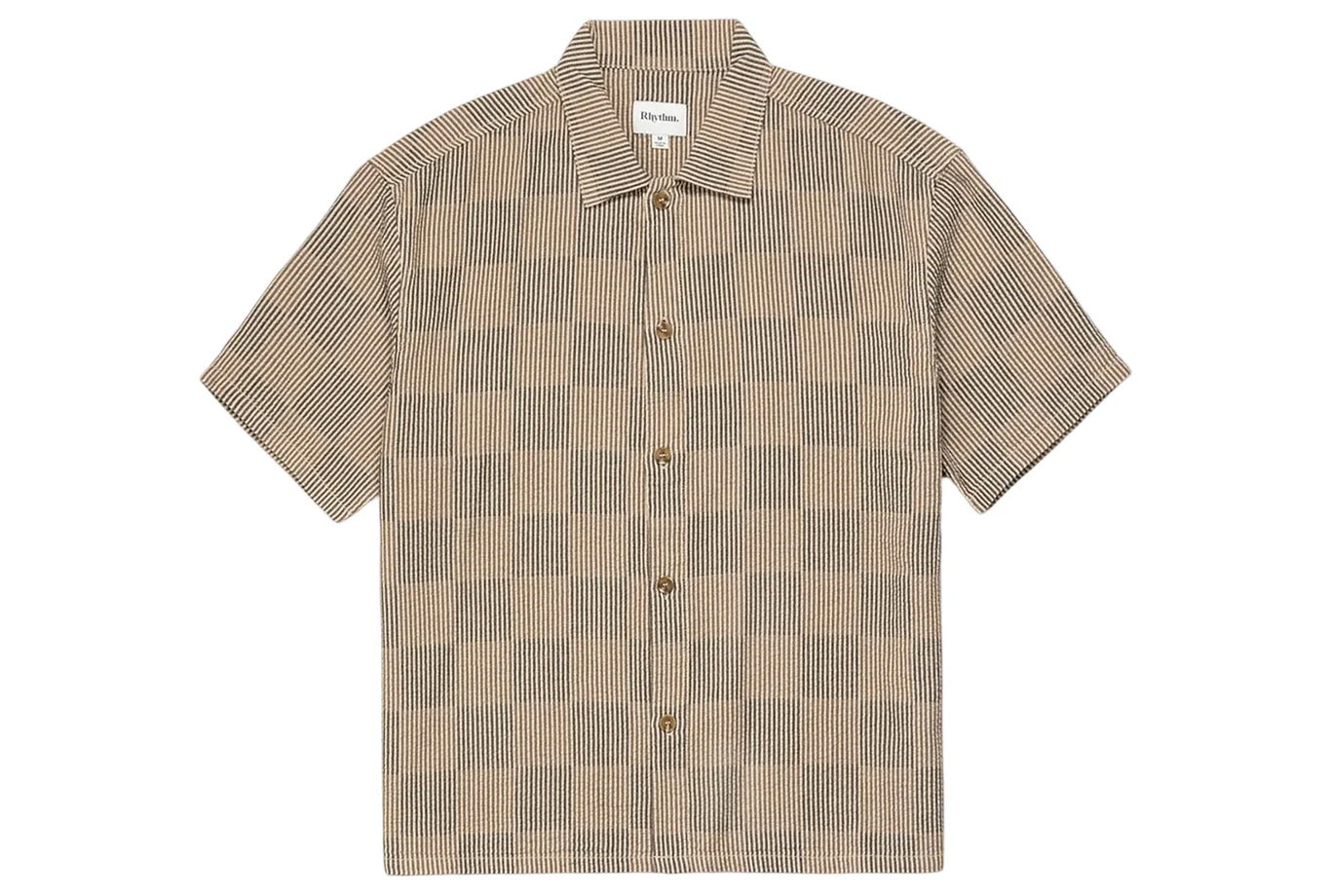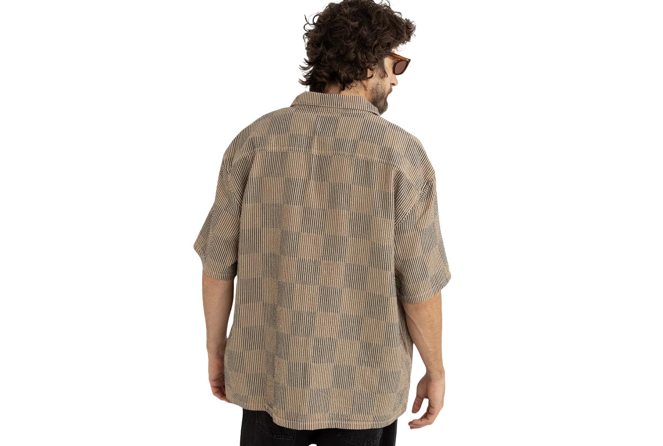 Make a statement with the Tanner Check SS Shirt in Tobacco. This relaxed-fit shirt features a plastic button closure, a one-piece collar, and a straight hem, ensuring a polished look for casual outings. The Rhythm labels and trims complete this stylish piece, perfect for layering or wearing alone.