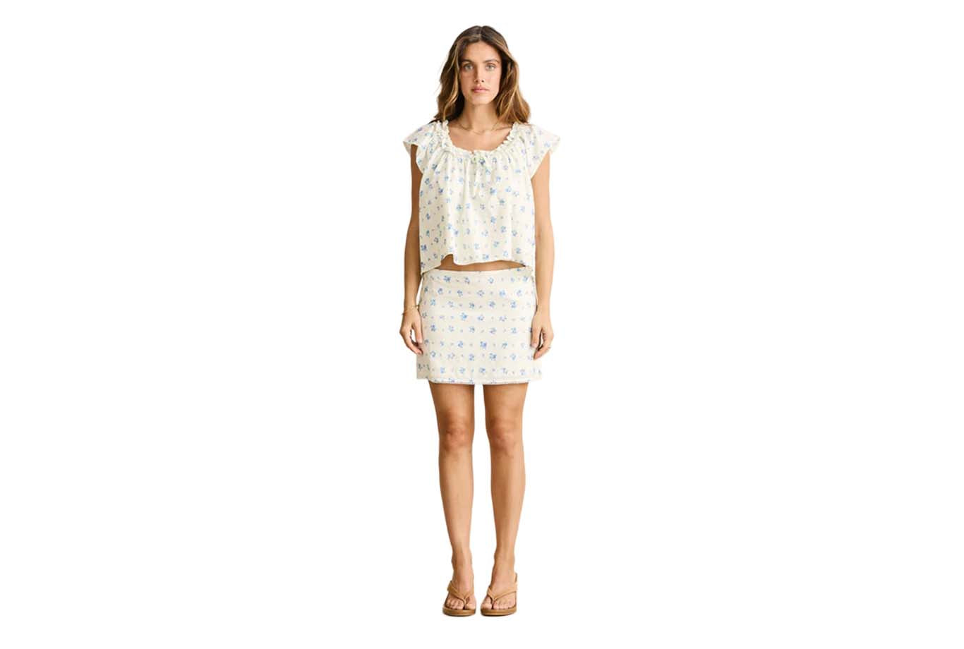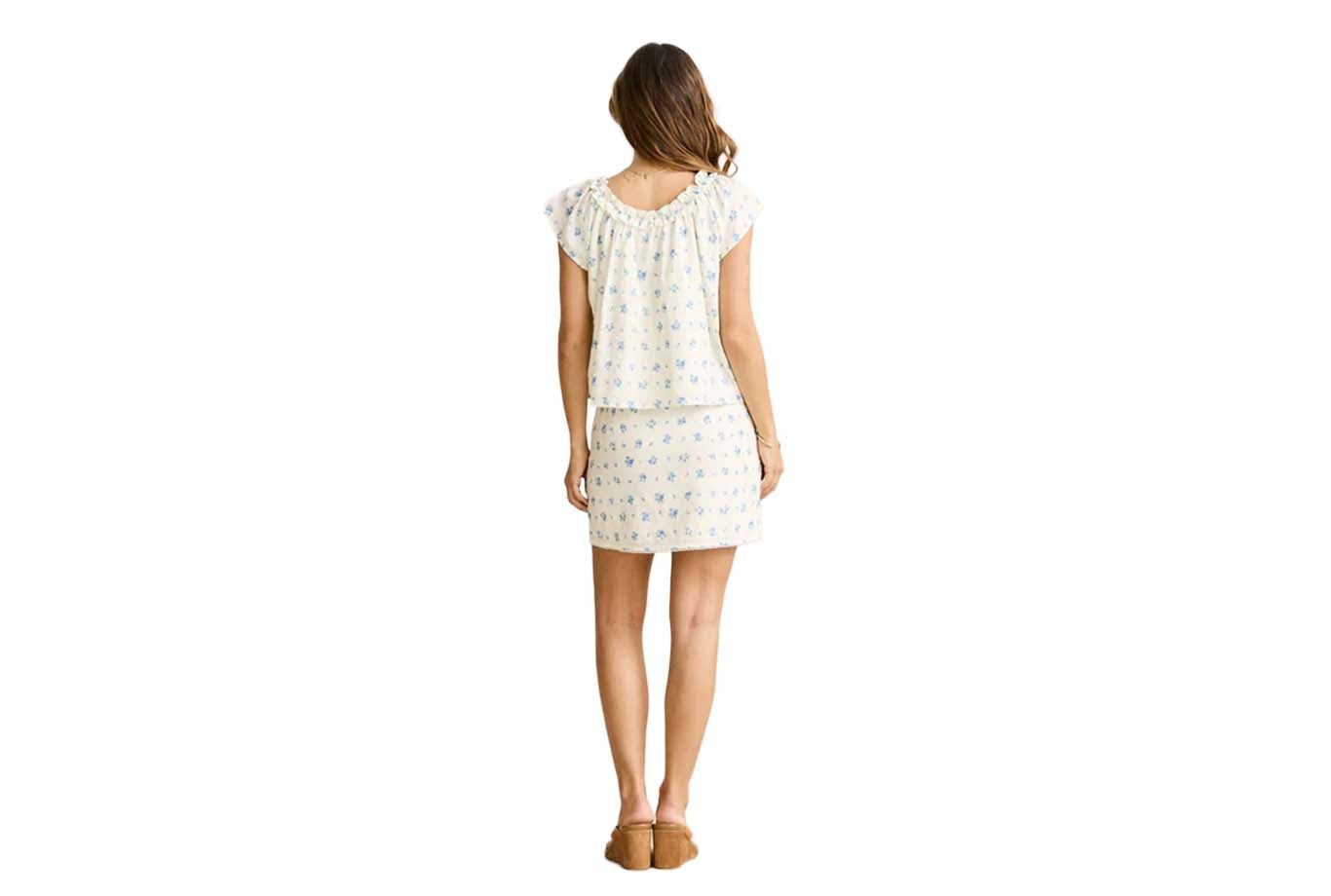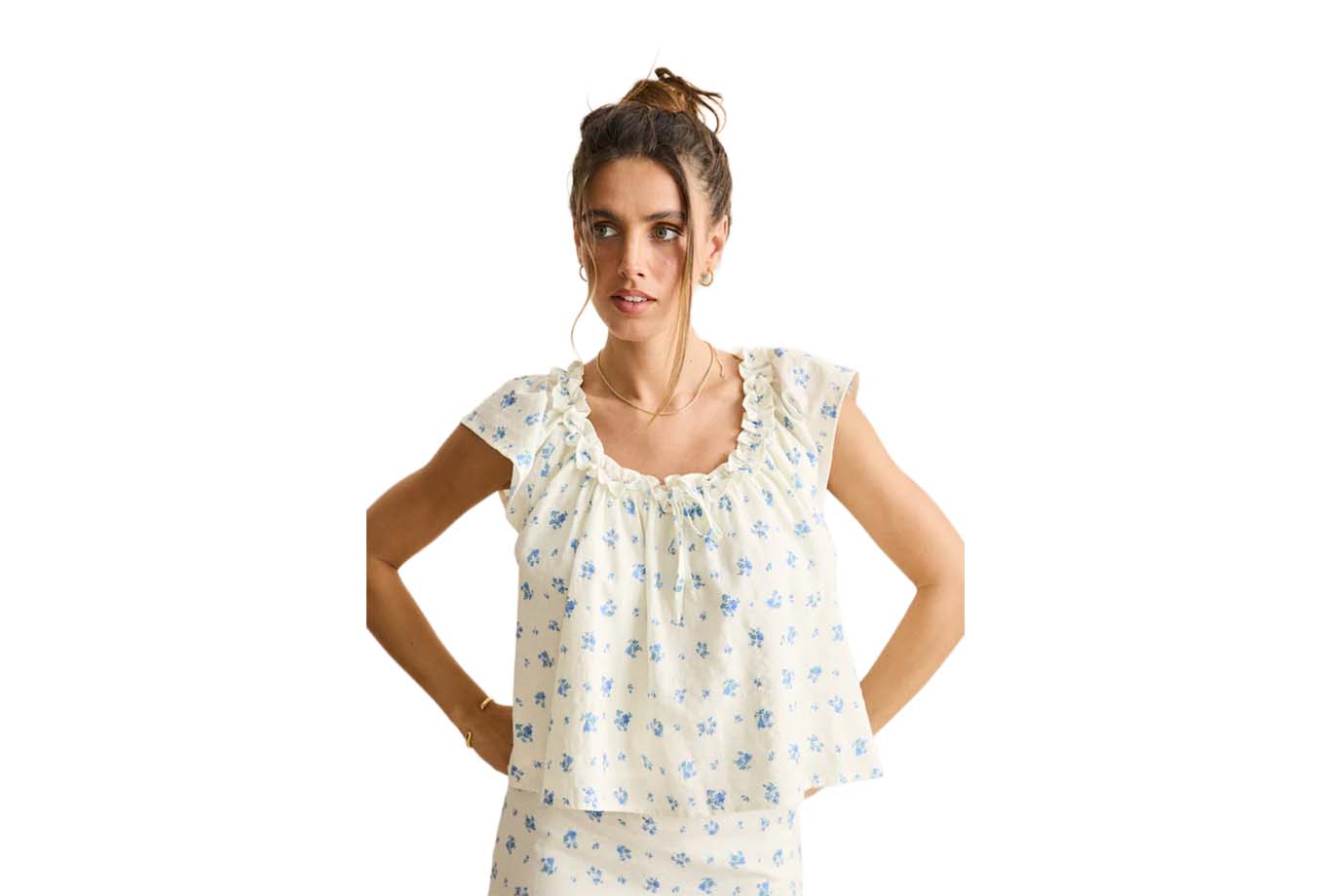 The Dahlia Frill Top in Sky is a breezy floral style with a ruffled neckline and flowing hem. Lightweight and textured, it’s a romantic staple for coastal layering.