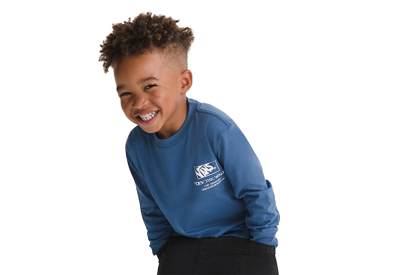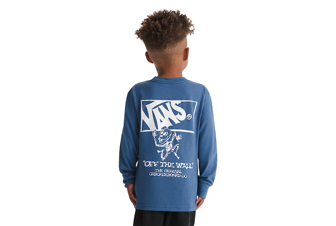 The Little Kids Checker Bones Long Sleeve T-Shirt is crafted using carded ringspun fabrication to make your shirt soft and strong, but still super comfortable. Artwork of the Vans logo on the front and the same with a dancing skeleton on the back adds edge to a classic-look crewneck.