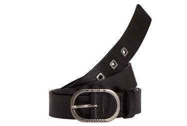 This leather belt brings a touch of attitude to any outfit. Crafted from full-grain leather for lasting durability, it features a sleek oval buckle with the Vans logo and metal stud detailing along the strap. The timeless design pairs easily with jeans or chinos, adding a subtle rebellious accent to your everyday look.