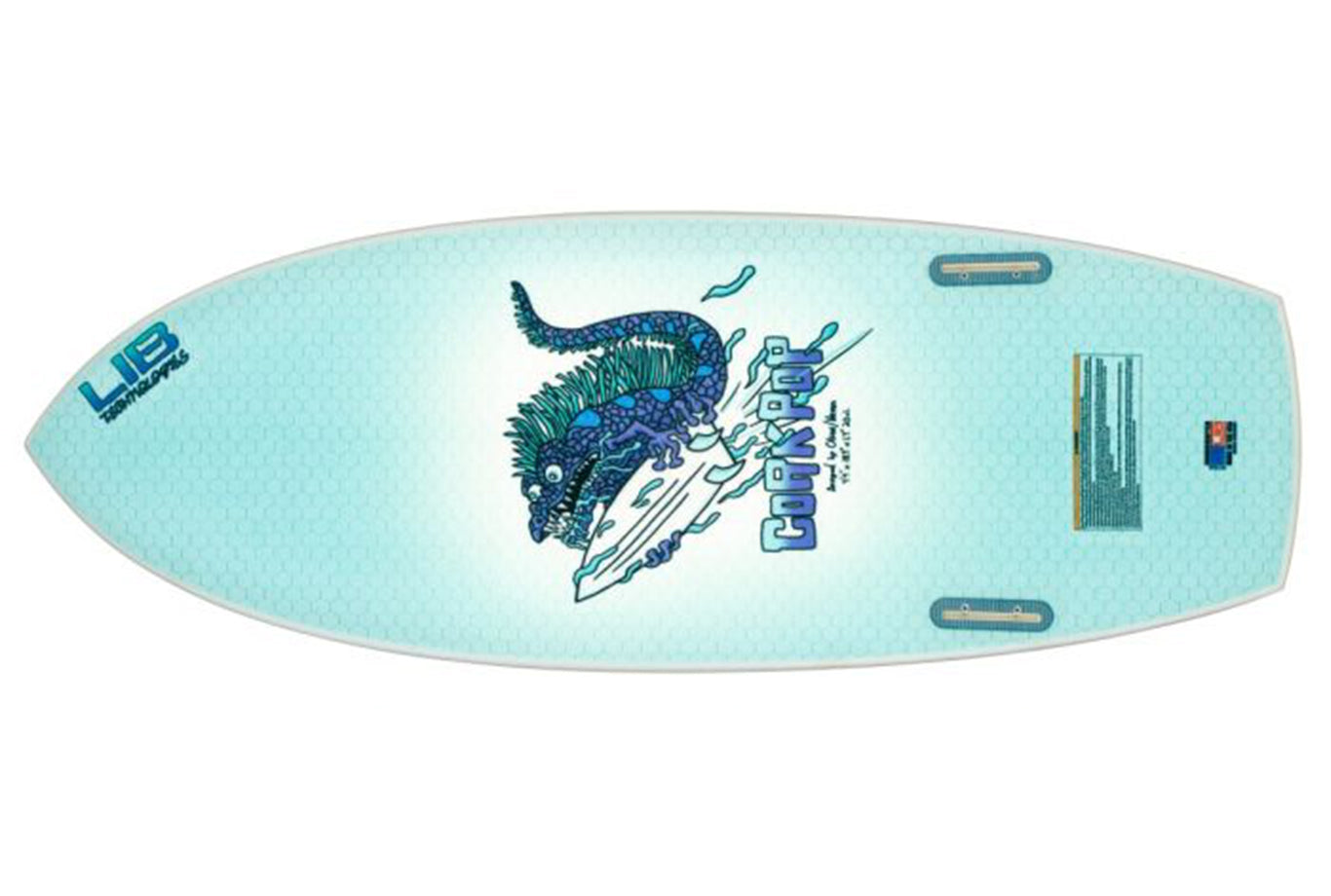 The Cork Pop “air enhancement device” is the latest freestyle surf/skate minded wake design from Mike Olson. The defining design feature of the Cork Pop is a thick “corky” square tail block to maximize volume/float/power under the back foot creating speed and literally exploding out of the water when you pop off the lip. Complimenting the poppy square tail, the plan-shape is all about wake expansion with; a narrow overall width, long straight rail lines and a slash minded beaked nose. Rocker line is flat with a mellow concave cutting through it into a speedy PAD (Particle Acceleration Dish) concave and a bit of flip in the nose. A catch-free loose but precise chined rail flows into a hard fast edge out the tail. This board is meant to be ridden short and create effortless speed, precise carving allowing you to take your freestyle and air game to the next level. Pop the Cork!