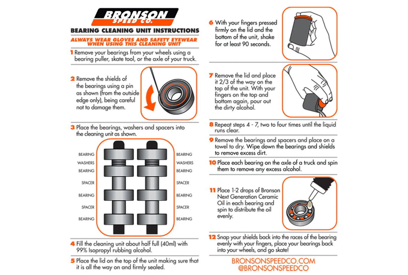 Bronson Speed Co.'s new bearing cleaning unit is an affordable and easy way to clean, and relubricate any set of bearings. Comes with spacers and axle washers and included instruction sheet.