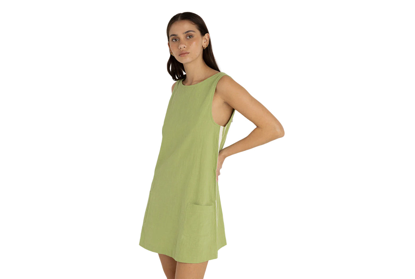 A breezy, boxy mini dress in soft green, featuring a scoop back for effortless style.